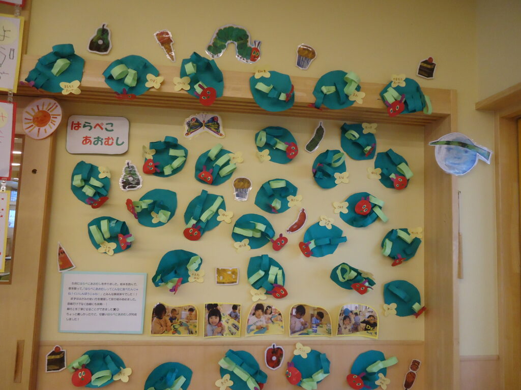 ○次は4歳児クラスの作品です。はらぺこあおむしが大好きだった事もあり、春の制作で立体あおむしくんを作りました。色々な所に動きだしそうな春らしい作品です。🐛🐞🌼