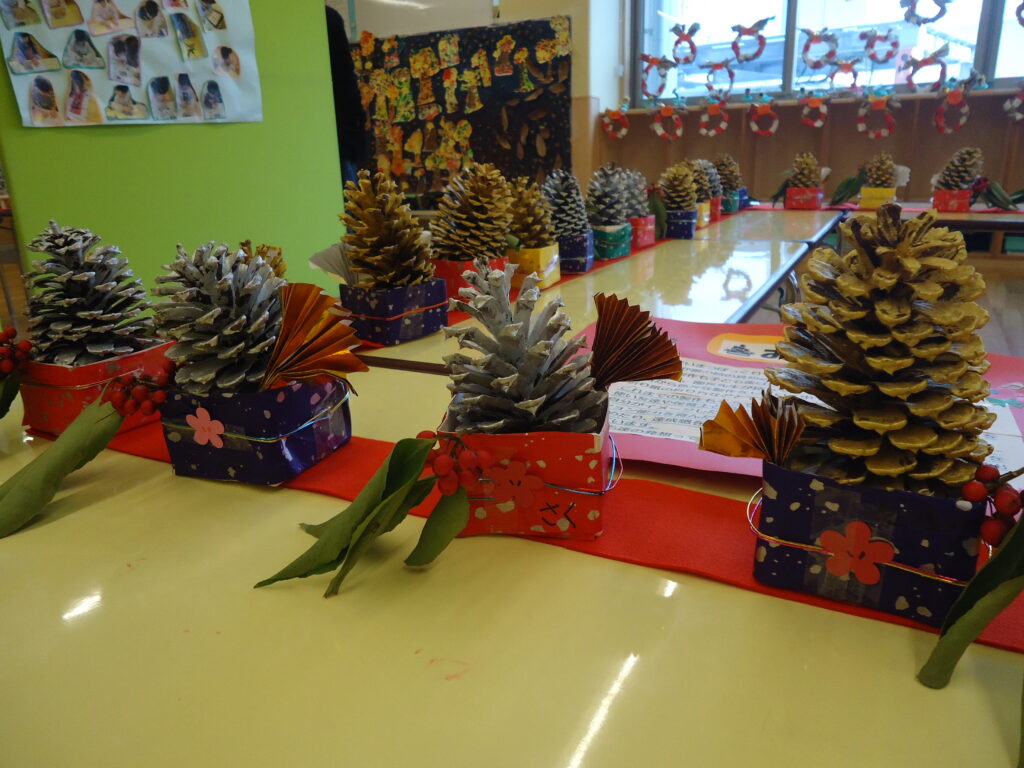 お正月の作品は張り子のだるまと大きな松ぼっくりを使ったお正月飾りです。🎍