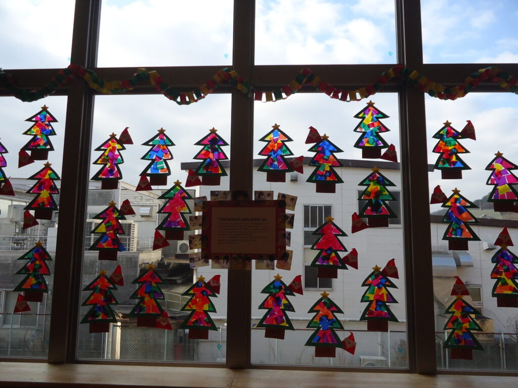 窓ガラスに飾っているのはステンドグラスのようなクリスマスツリー🎄クリスマスの形にカラーのセロファンを細かく切って余白のないように貼りました。とっても綺麗です。✨✨