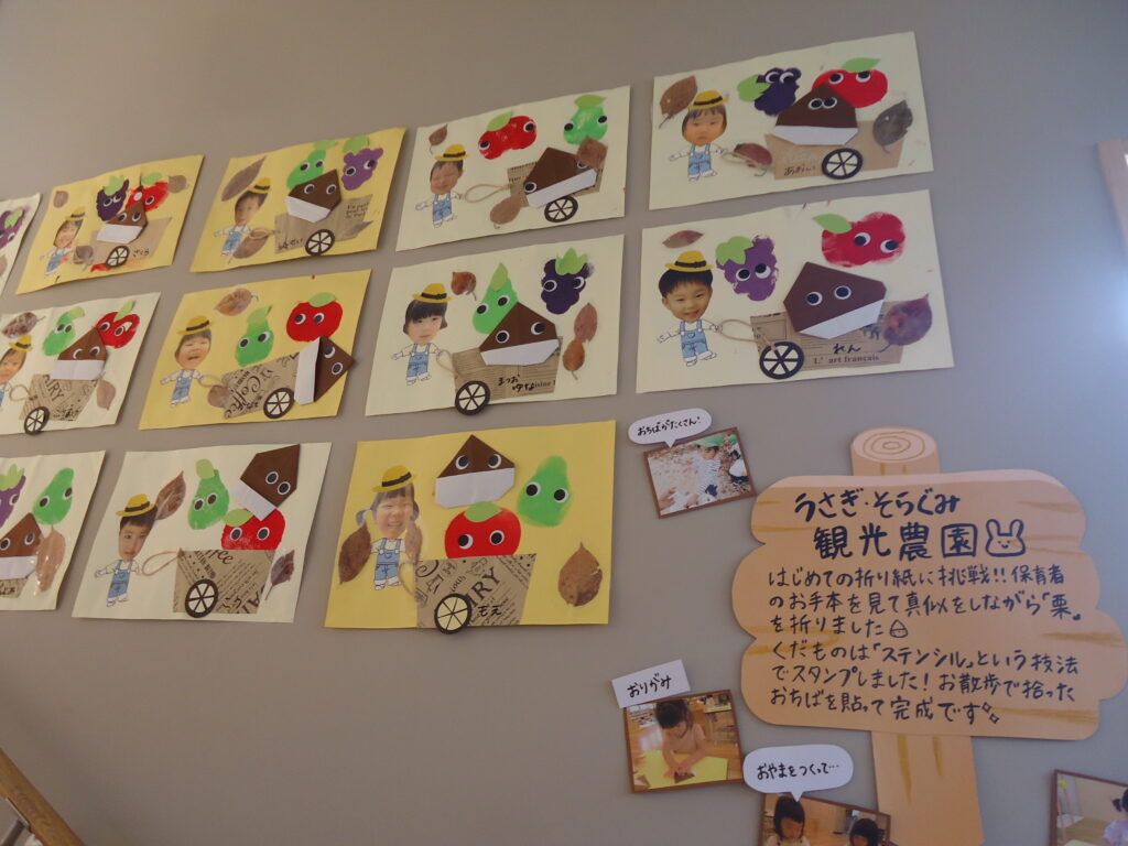 秋の作品は・・・初めての折り紙で栗を作り、ステンシルで果物🍇自分達で拾った落ち葉を貼って一人ひとりの可愛い観光農園が出来ました!!👏子ども達の笑顔が眩しいです😆