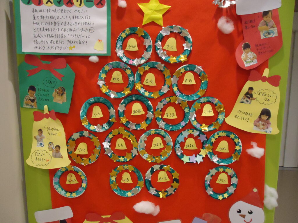 初めて、のりを使いリースに星🌟をペタペタ。難しかったけど頑張って貼りました。みんなのリースを並べるとこんなに綺麗なクリスマスツリーが出来ました👏