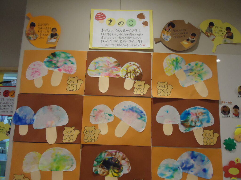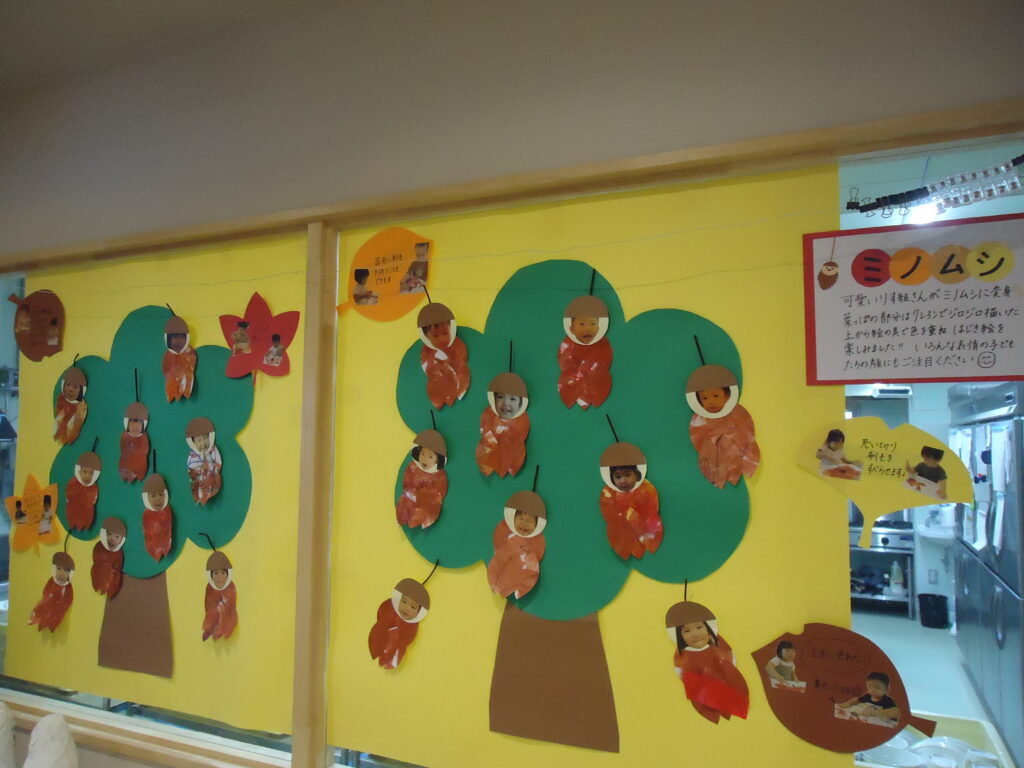 ○これは、0歳児クラスの作品です。ペタペタして作った紅葉の木やぶら下がっているみのむしくんやきのこ達、とっても楽しそうですね。