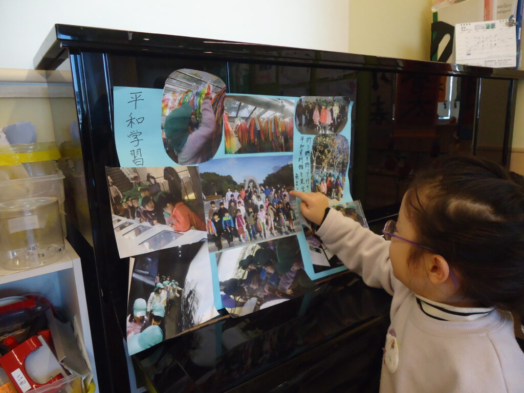○そして最後は5歳児クラスの作品です。平和について学んだ事で平和公園の原爆ドームや原爆資料館での学びが絵画に表現されています。
