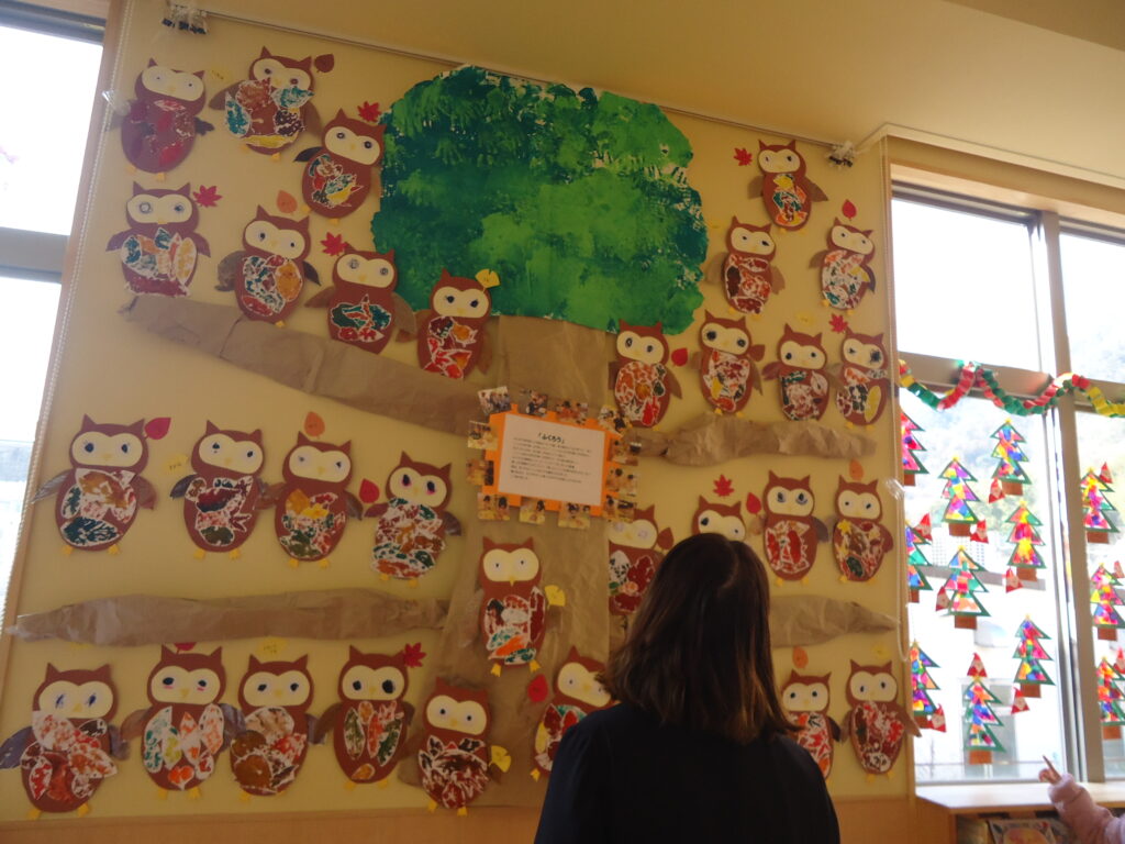 ○次は3歳児クラスの作品です。秋に散歩に出掛け落ち葉拾いをし、落ち葉を使ってのステンシル。ふくろうさんの羽がカラフルでほんとの羽のように見えて素敵ですね(*^▽^*)