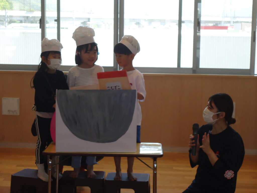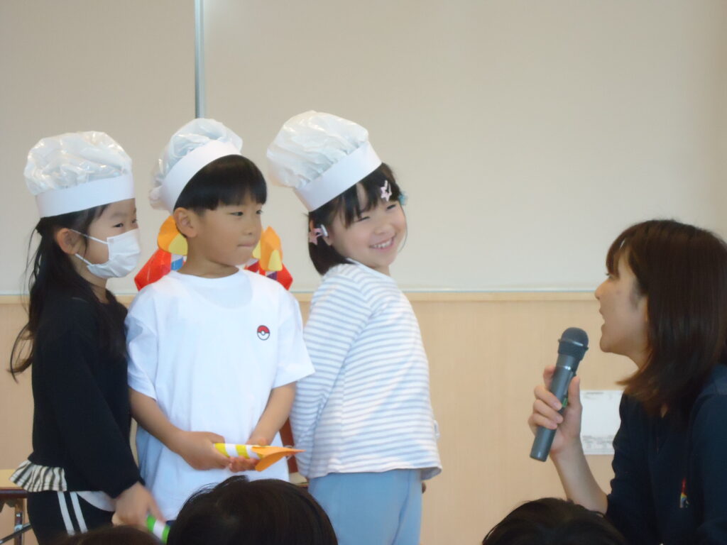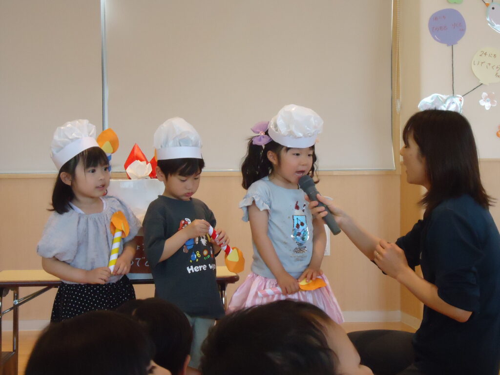 年中組さんや年長組さんは・・・・・好きな遊びや大きくなったら何になりたいですか?を質問され、元気よく答えてくれました。(*^▽^*)