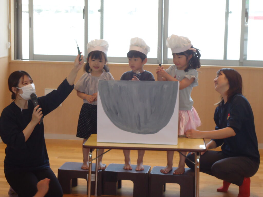 次は年中組さんが、ボールに入っている小麦粉や卵、牛乳をたくさん、まぜまぜして、オーブンに入れると、