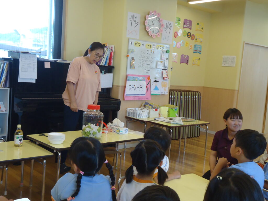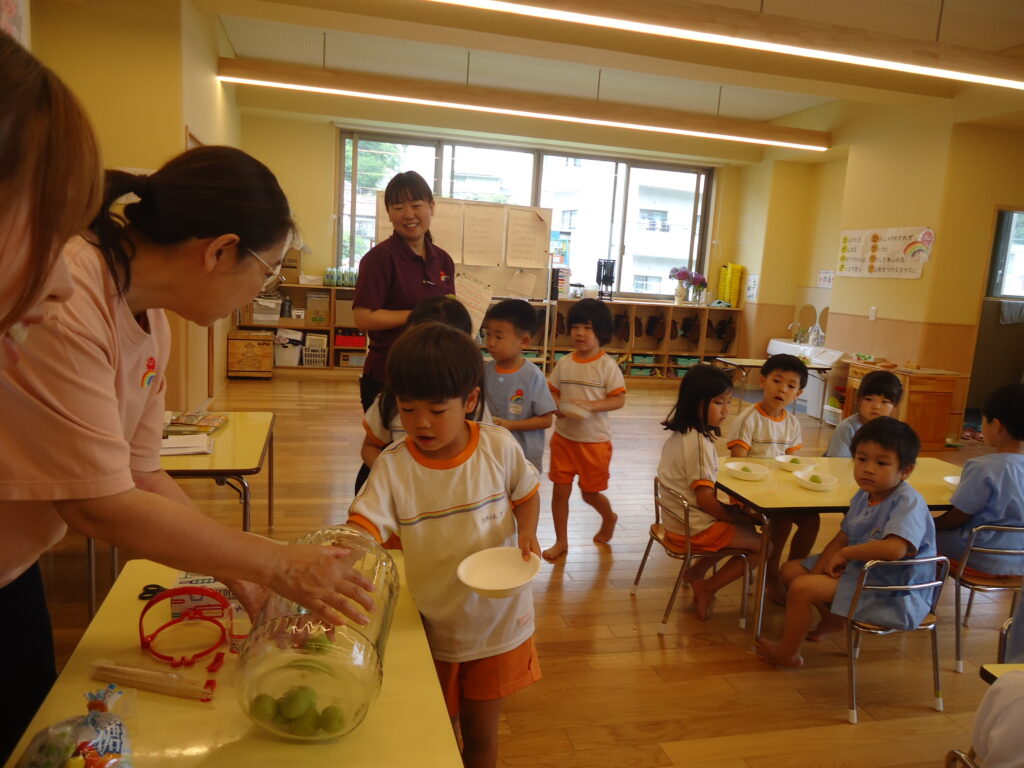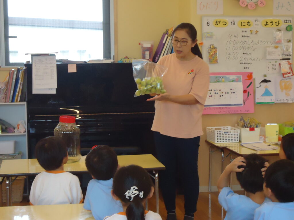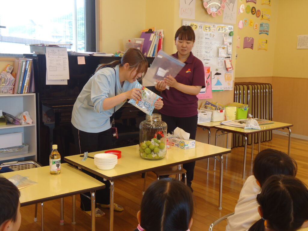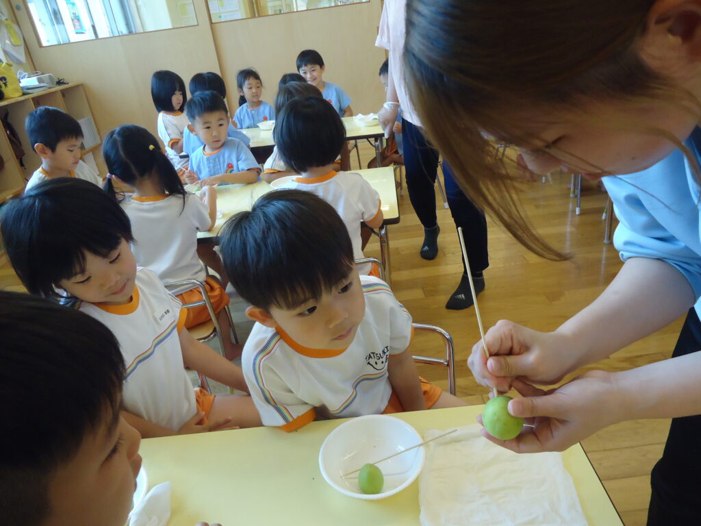 今年も梅の時期がやってきました。みんなで梅ジュース🍹を作ろうと、園長先生が年長組さんにお願いをしにきましたよ。