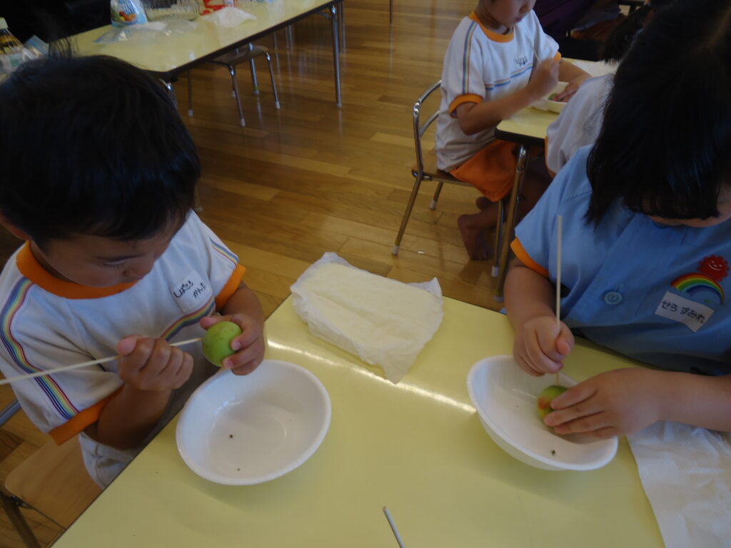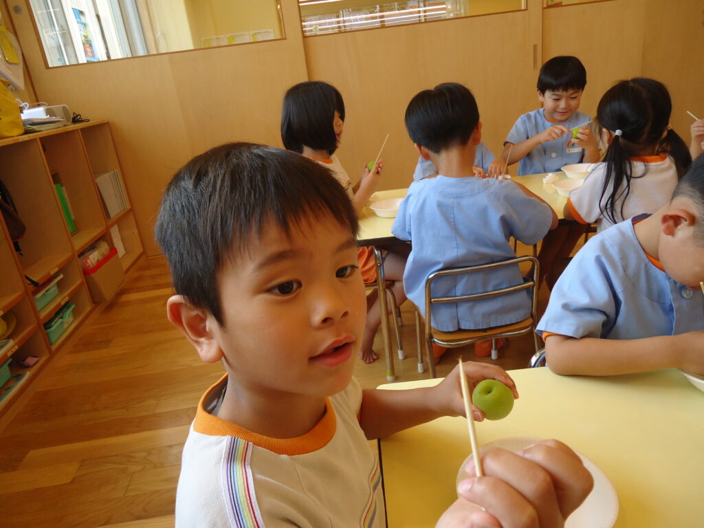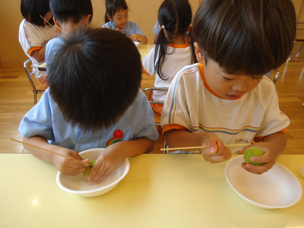 「梅ジュースを作ろうと思うんだけど、みんな、手伝ってくれる?」と相談され、お手伝い大好きな年長組さんはすぐに「いいよ!」のお返事。早速園長先生からやり方の説明を真剣に聞きました。