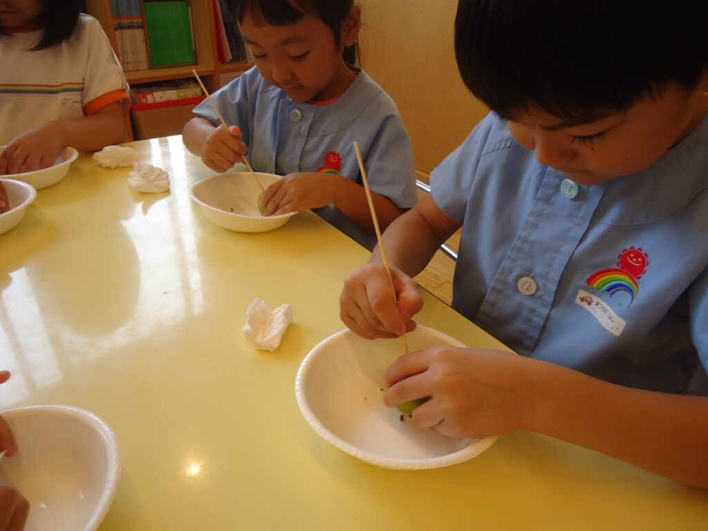 ヘタを取ったら、今度は梅に穴をあけていきました。