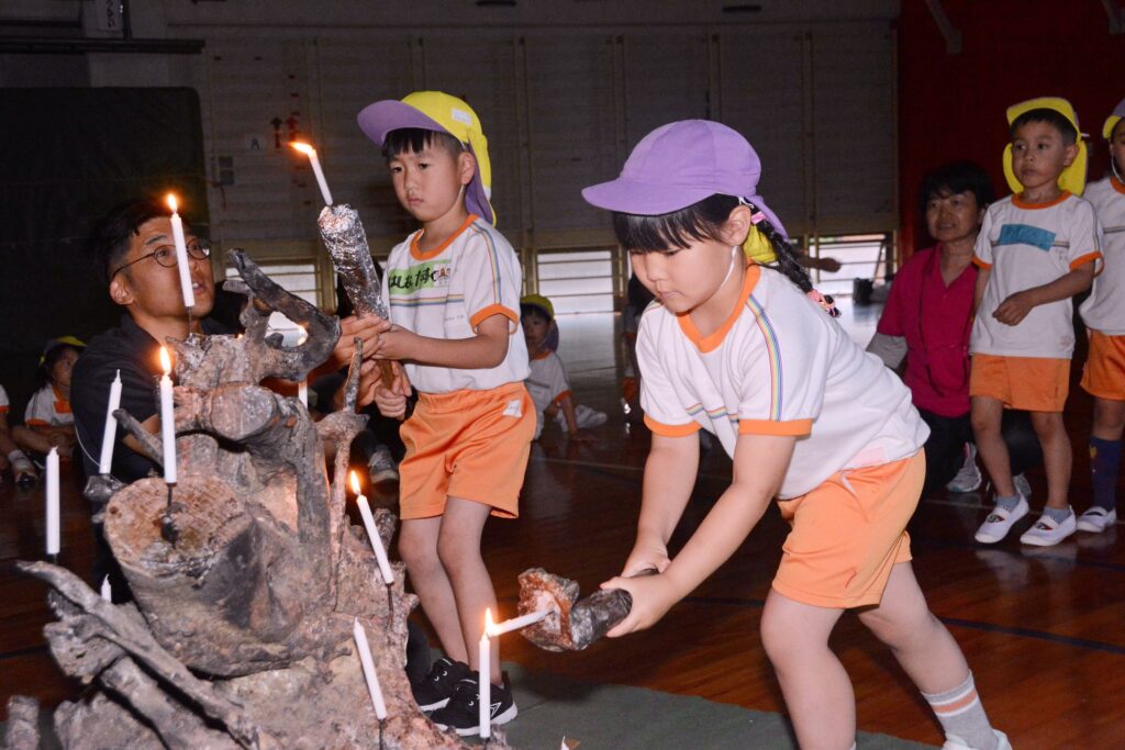 夕食の後は体育館でキャンドルサービス✨✨晴れていれば外でキャンプファイアーの予定でしたが、体育館でのキャンドルサービスもとっても綺麗で、みんなでろうそくの火を見つめながら、火の神様のお話や、各園からの出し物を見たりして、盛り上がりました🎵