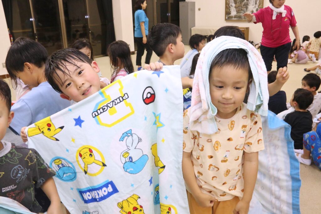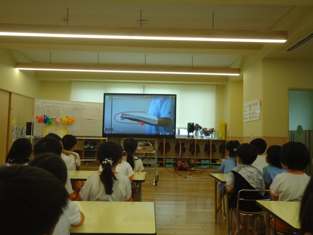 「こんな風にシーツを畳むんだって!」 と寝るときに使ったシーツの畳み方を見て、明日からのお泊り保育が益々楽しみになりました。