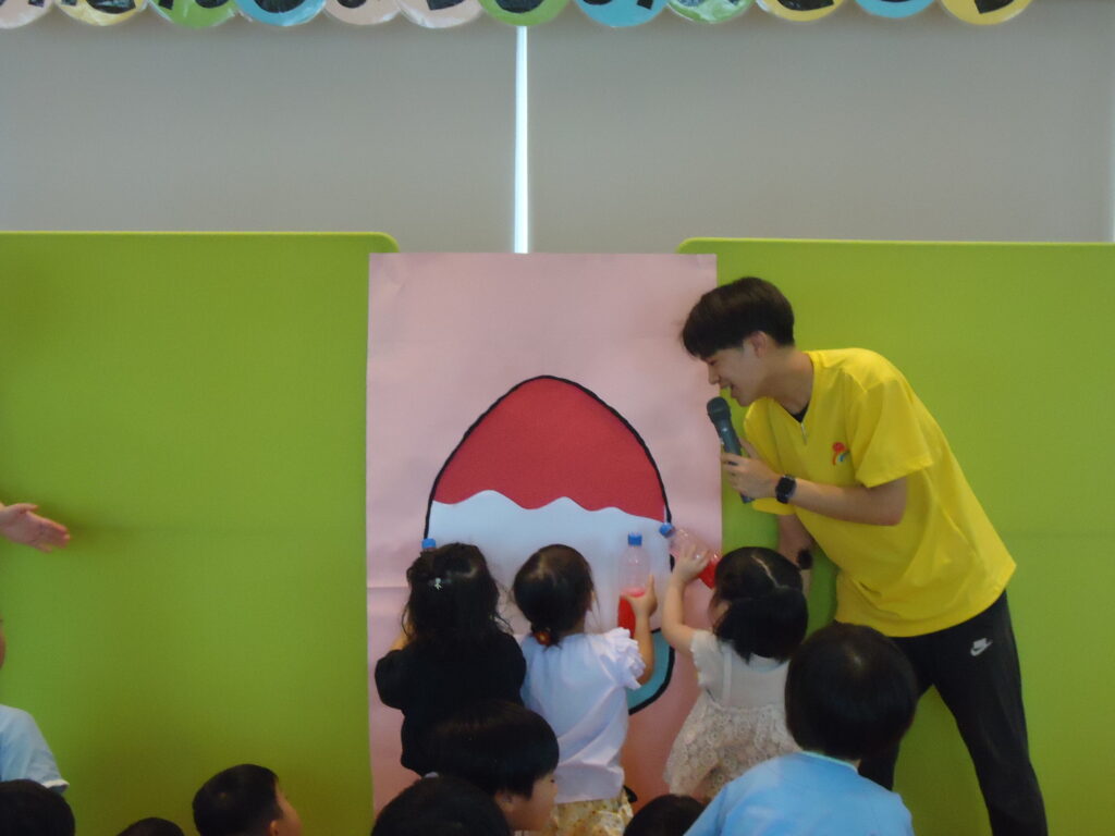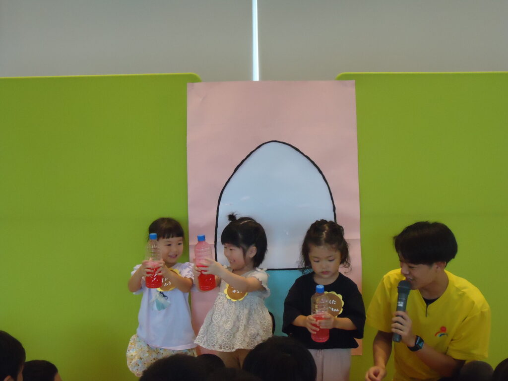 先生たちからの出し物は「色水シアター(かき氷編)」✨✨まずは先生達が持ってるシロップをかけることに・・・・・さてさてどうなるかな??