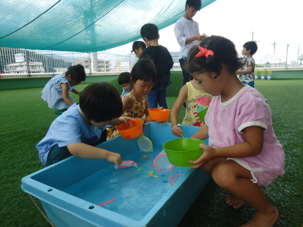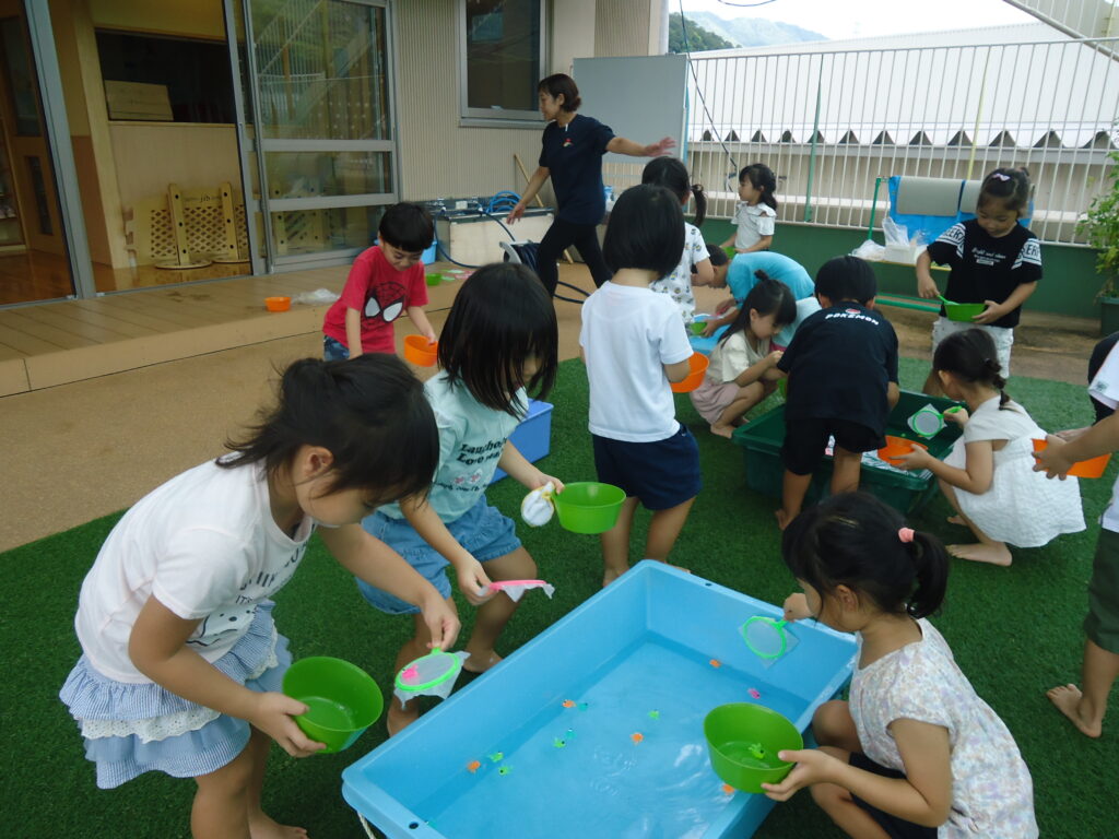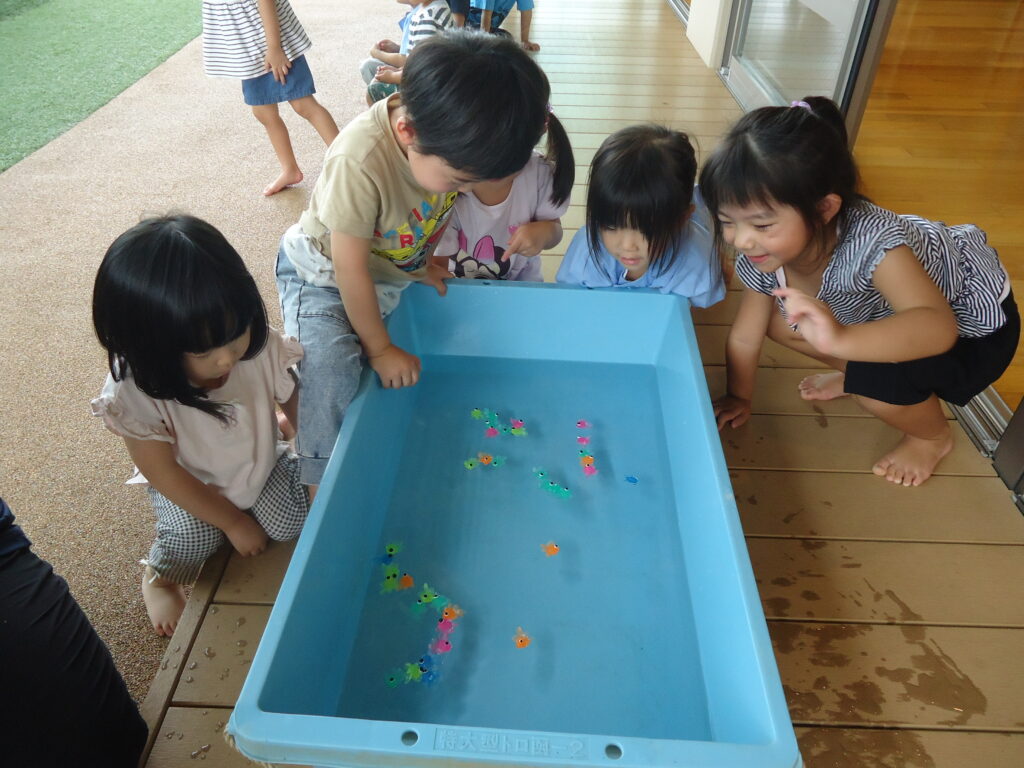 そして今日は1号さんの登園日ということもあって、誕生日会の後にみんなで金魚すくいを楽しみました🐟水に浮かんでいる金魚を見て本物の金魚みたいと大喜び(笑)