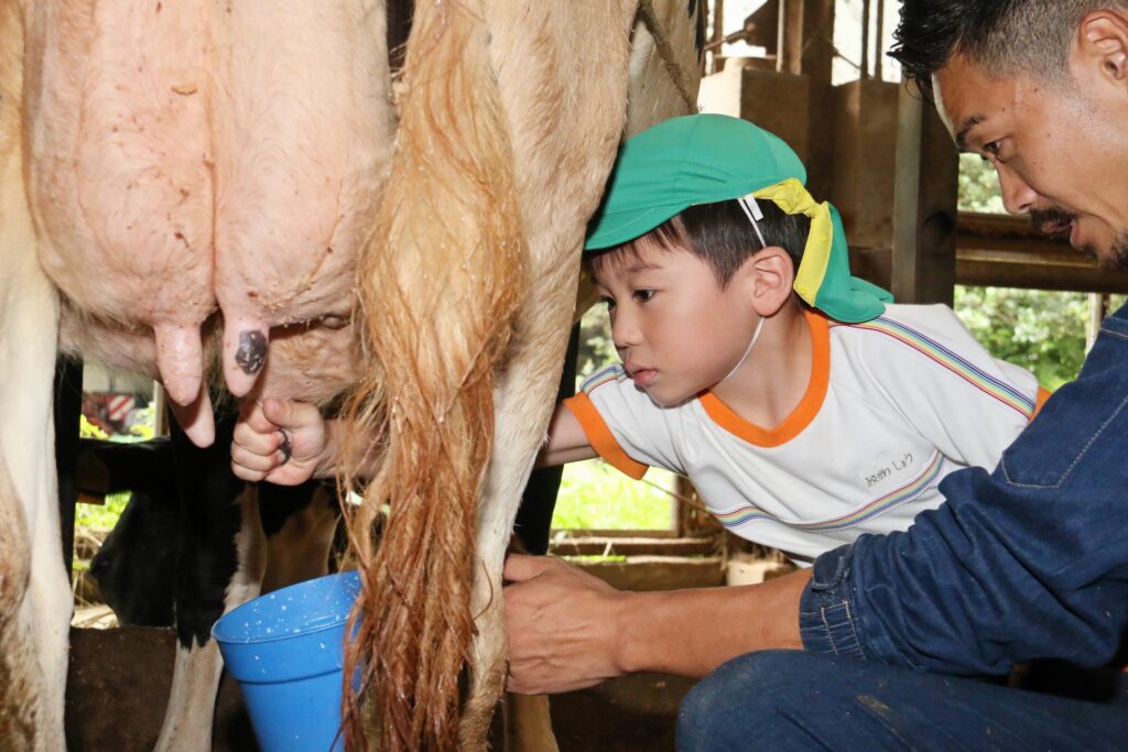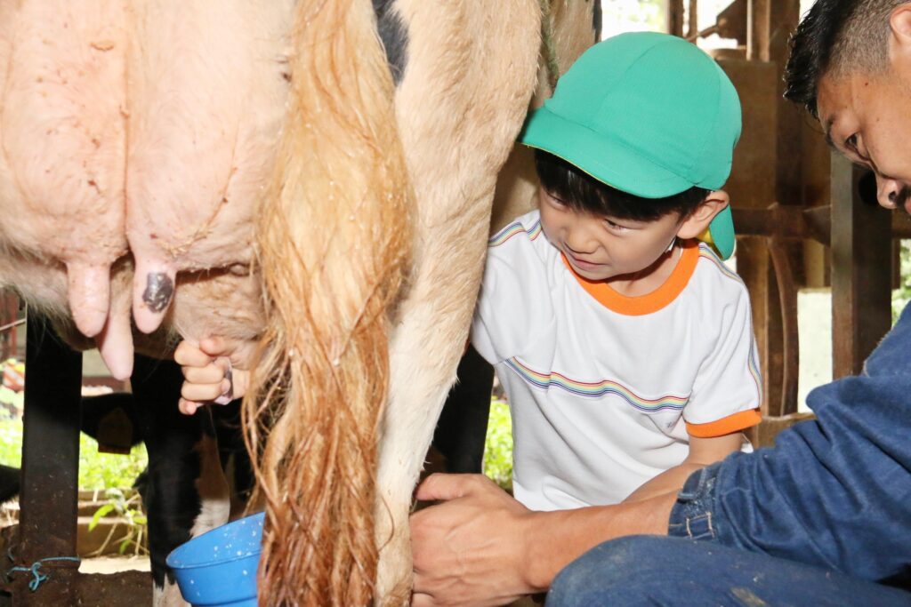 年長組のきい組さんは、初めての乳絞りに挑戦!牛さんのお乳は柔らくて大きいけど、いざ絞っても中々出なくて一苦労(^^;)