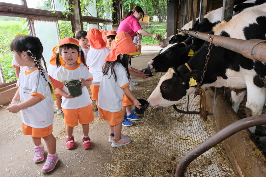 年少組のもも組さんは間近で見る、やぎさんや牛さんにちょっとびっくりしながらも、頑張って干し草をあげ、うれしそうでした。(*^-^*)