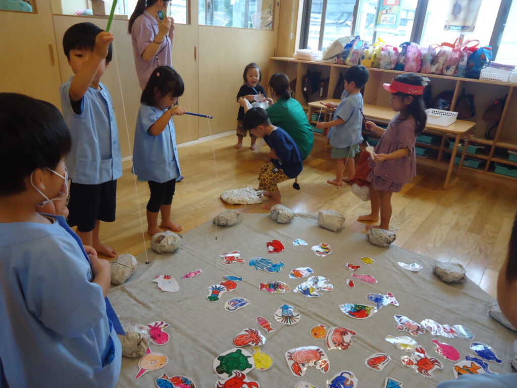 魚釣りコーナーでは・・・・・・年少さんが作った色々なお魚たちの中から、自分で選んだお魚めがけて、えいっ!!と釣り竿を投げ釣っていますよ。