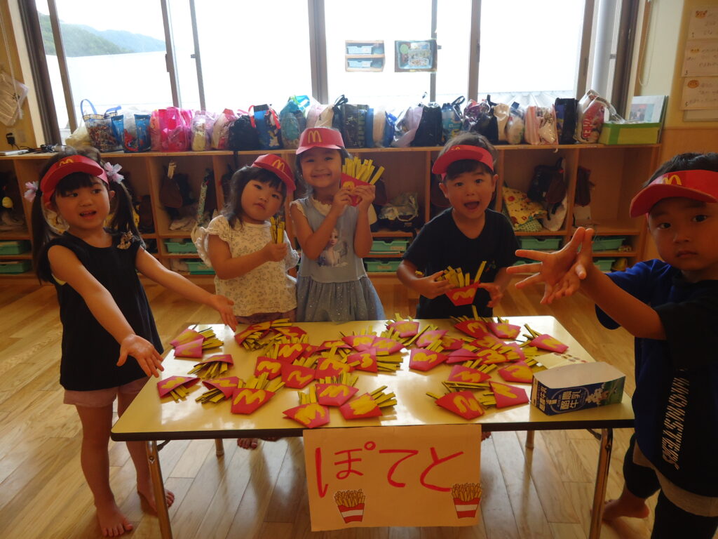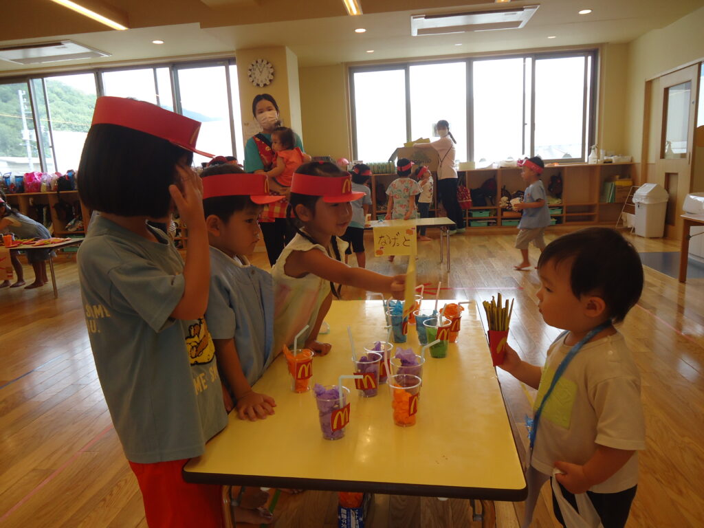 「いらっしゃいませ~ポテトはいかがですか?」・・・今度は年中のあか組さんがマクドナルドの店員になり元気よくお出迎え🍟