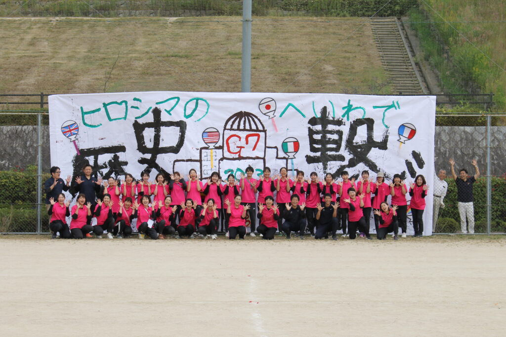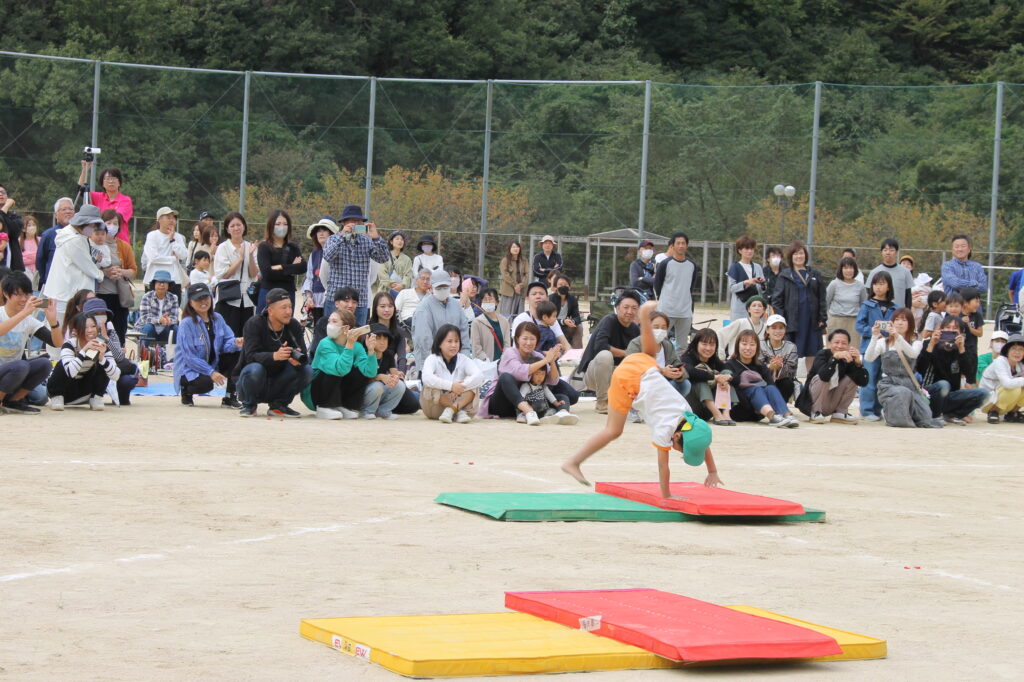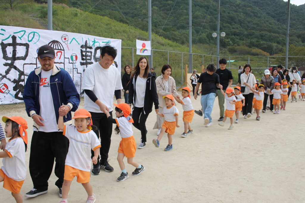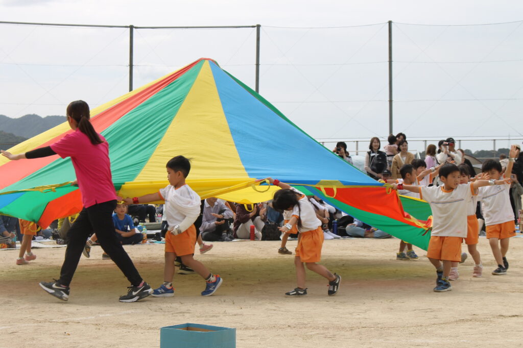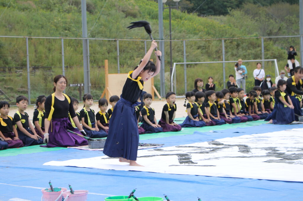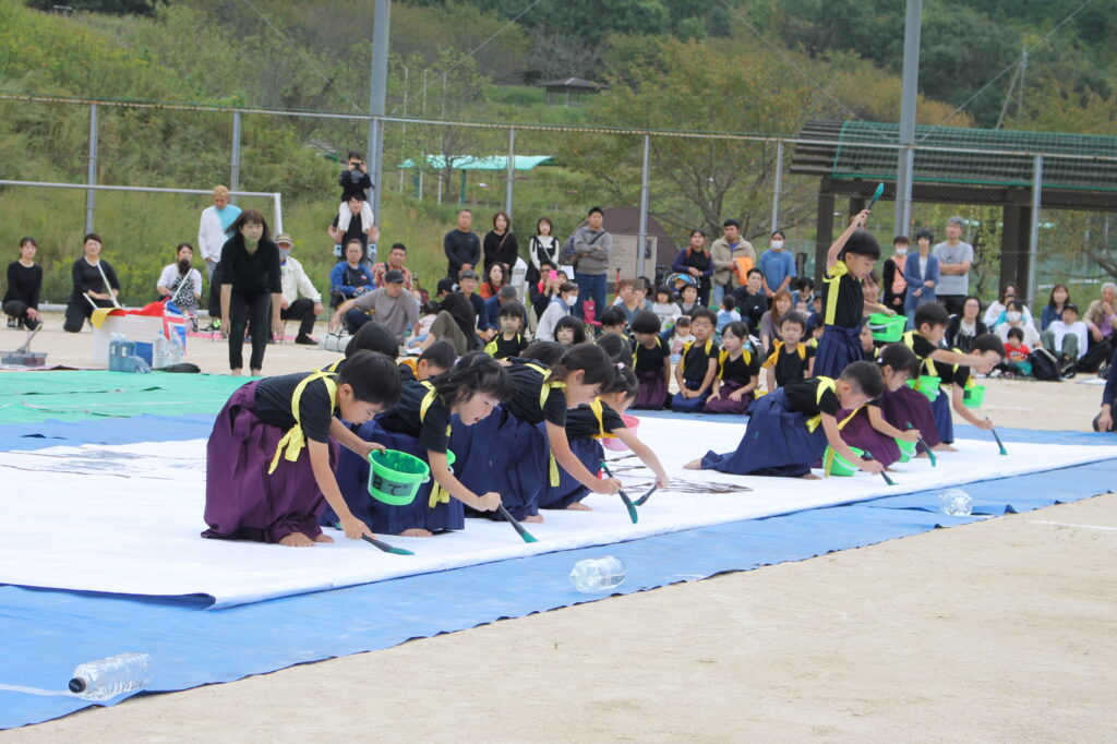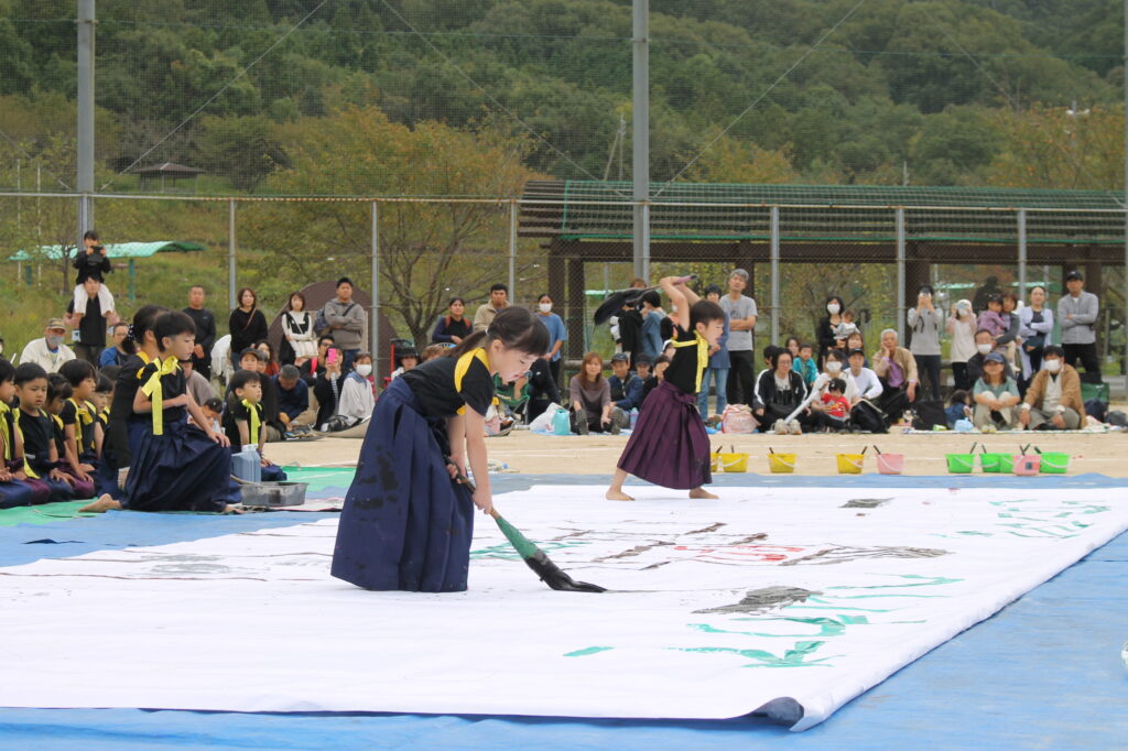 10月7日(土)、秋晴れの中、海田総合公園で大運動会が行われました。今年は第二園と合同という事もあり、練習の時から、河川敷や総合公園で一緒に練習し、息を合わせながら取り組んできました。まずは、きい組さんによる書道パフォーマンスです。