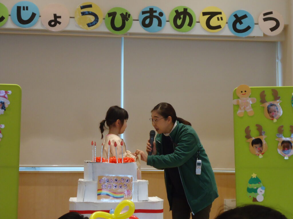 そしておまちかねの12月生まれのお友だちは16名。 3歳になるお友だちは、少し緊張気味でしたが、園長先生からのお誕生日プレゼントをしっかりもらっていましたよ。