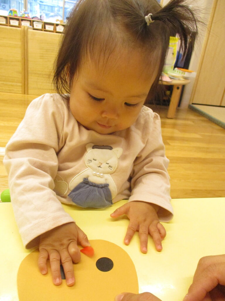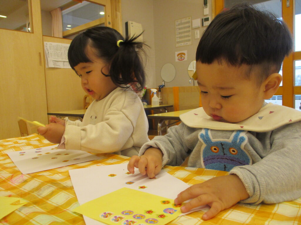 指から離れないシールに苦戦しながらも、保育者の助けをもらいながら貼り付けることに大成功(*´ω`)!!普段からシール貼りを遊びに取り入れていたので、指先をしっかりと動かしながらできました!!集中力も凄いです!!