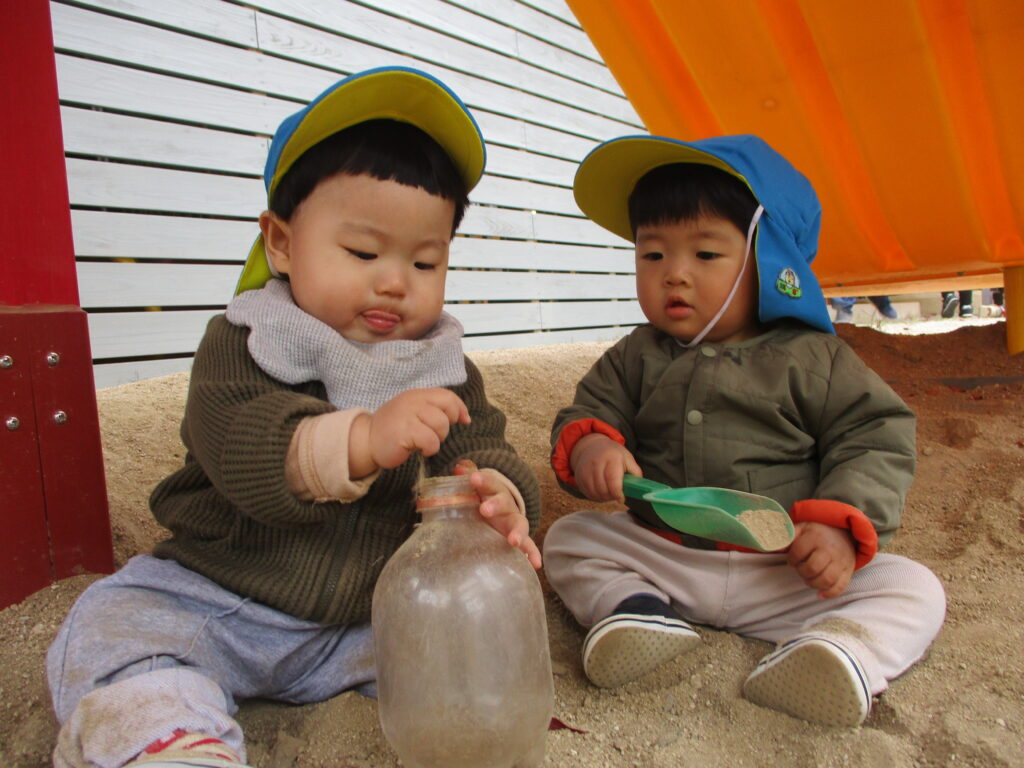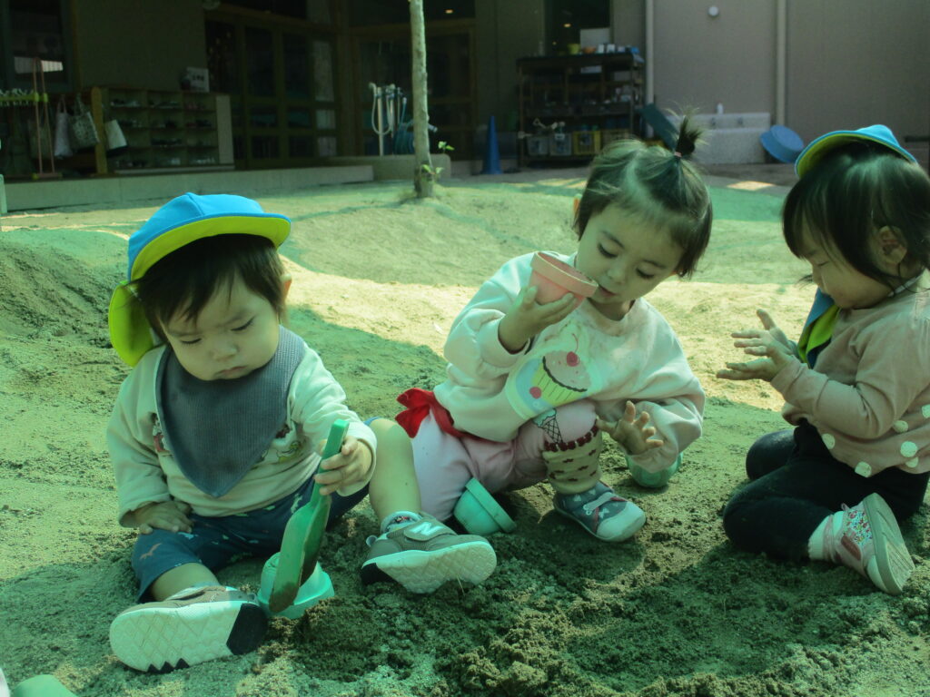 外遊びでは、スコップなどのおもちゃを持って砂をすくったり、手の平全体で砂や泥の感触を楽しんでいます。