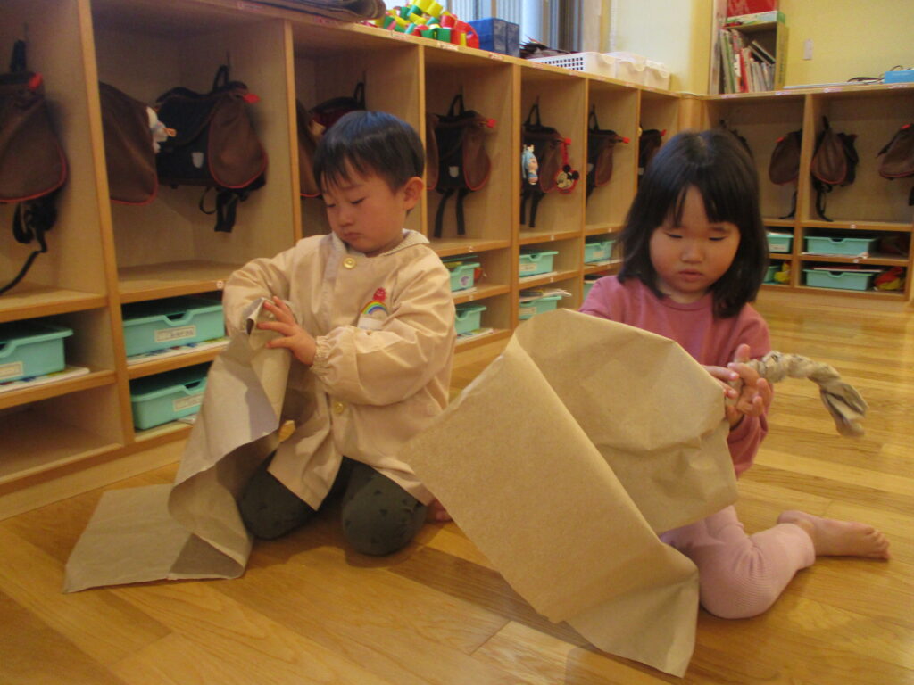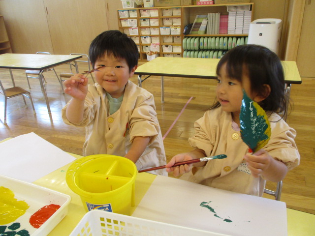 お兄ちゃん・お姉ちゃんたちがかっこいいものをつくっていると、「こんなのつくってみたい!」「私・ぼくもやりたい!」と興味をもってやってみようとする気持ちが芽生えています。ももぐみになると細かい作業にも集中しながら、製作の時間を楽しんでいます。