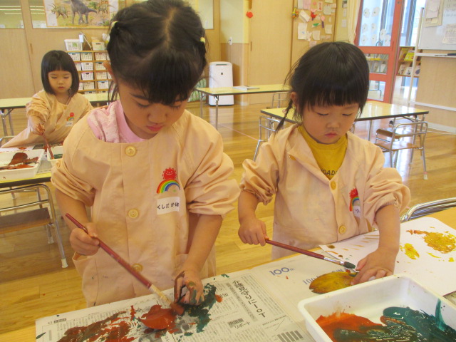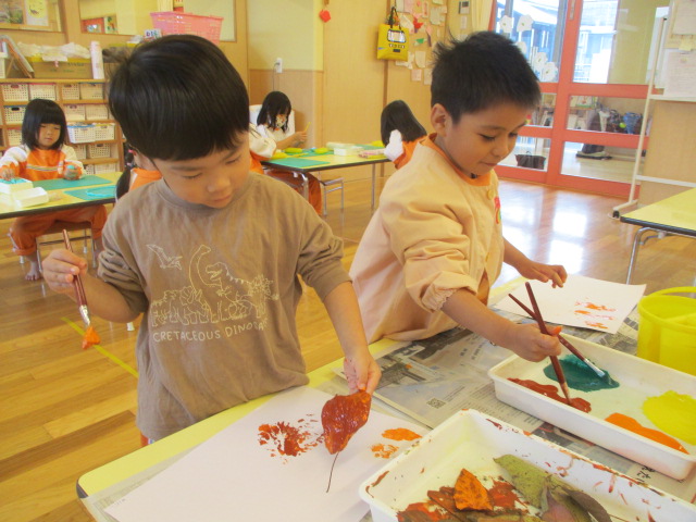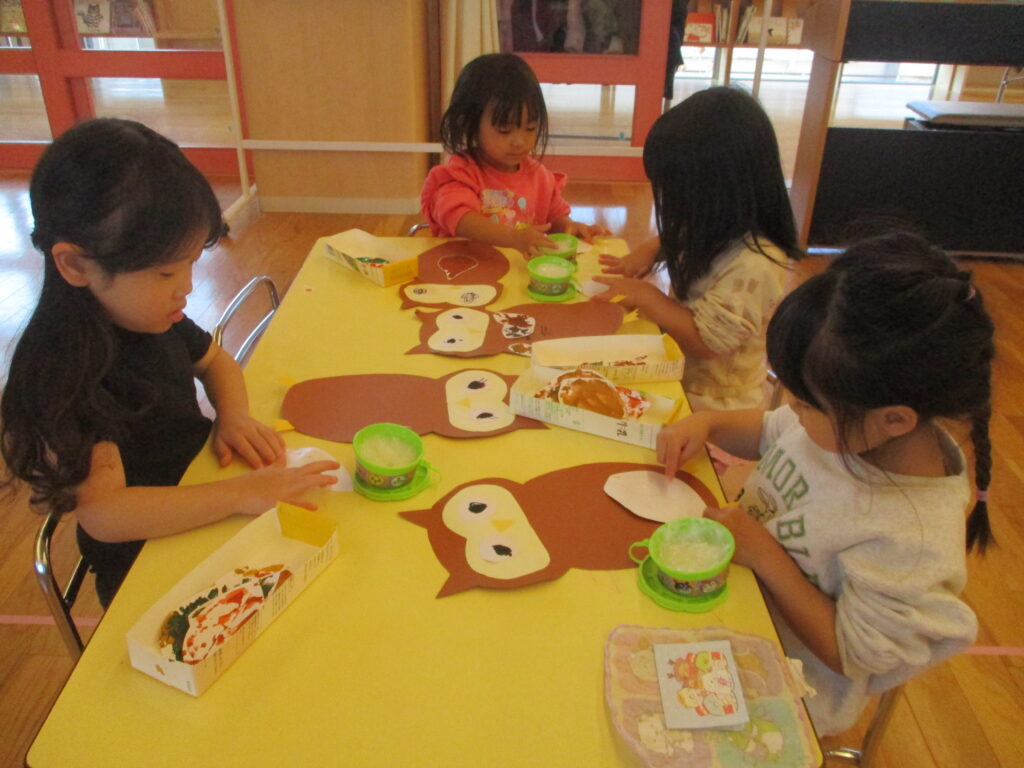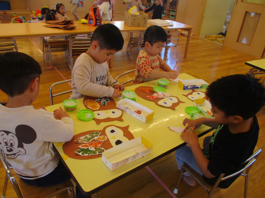 落ち葉をたくさん見つけると、「見て~こんな色の葉っぱがあったよ!」など、いろんな形・色のはっぱを見つけて大喜び♪一人一人自分の好きな葉っぱを見つけ、その落ち葉を使って、ふくろうの模様をイメージして葉っぱスタンプをしました。紙に葉っぱの模様がつくと「葉っぱってこんな線があるんだね」と普段気付かない事にも気付く機会となりました。そんな細かい所にも気付けるようになったももぐみさんです!絵の具が乾き、切り取ったものを自分たちでのりづけ。「お指は一本で塗るんだよね。このくらいかな?」などのりがどれくらい必要か自分で調節しながらぬりぬり。貼り付け終わると、「先生できたよ!葉っぱの模様がかわいいでしょ♡」と完成したものを見て嬉しそうでした。