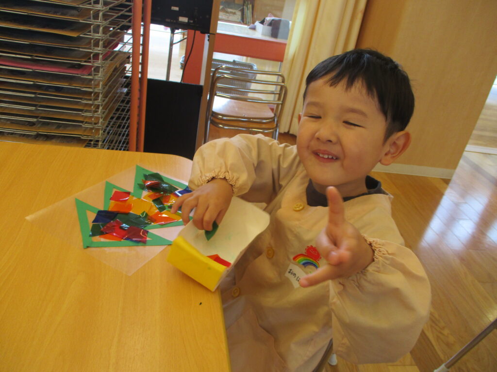 クリスマスツリーでは、好きな色のセロファンシートを選んで、「この色はどこに貼ろうかな?」と考えながら貼りつけ、クリスマスツリーに段々と色がついていくのを楽しみながら作ることが出来ました。