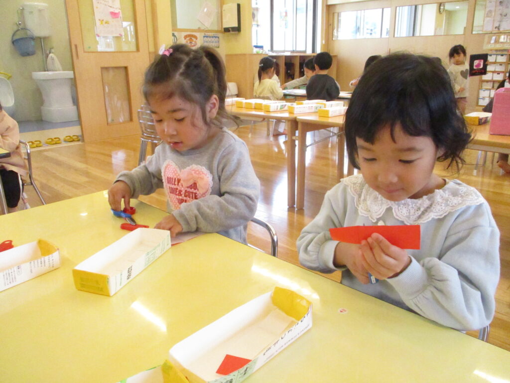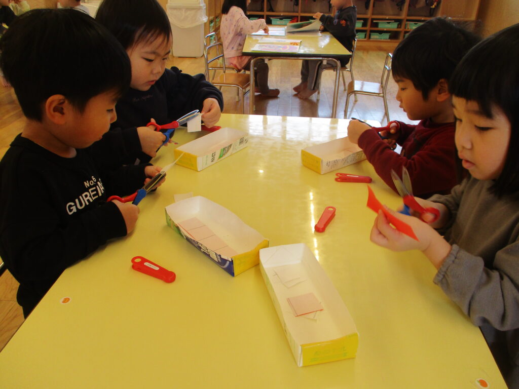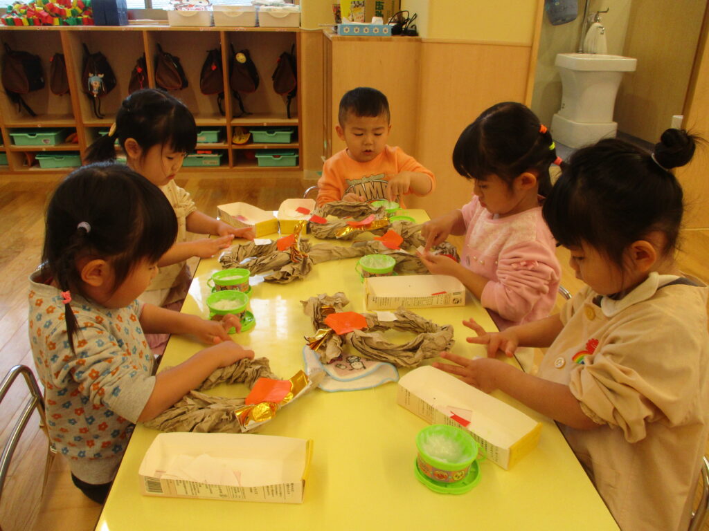縄の部分は、クラフト紙を力いっぱいギュッ!!とひねって輪っかにして形をつくりました。最初は、「できない」「どうやってやるの?」と難しそうにする子もいましたが、保育者が少しだけひねりやすいように形をつくってあげると、そこからは子どもたちがスラスラとでき、「自分でできたね」と伝えると嬉しくてニヤリ( ̄ー ̄)していました(笑) また、ハサミを使っての作業では、ハサミを持ち、手を動かす際には、「グー、パー」と言って紙を切ったり、中には口も一緒に開く可愛い姿も見られました。先生のお話をしっかり聞いて安全にハサミを使えました。最後に、折り紙で折ったみかんとハサミを使って切った紅白の折り紙をのりで貼り付けたら完成✨