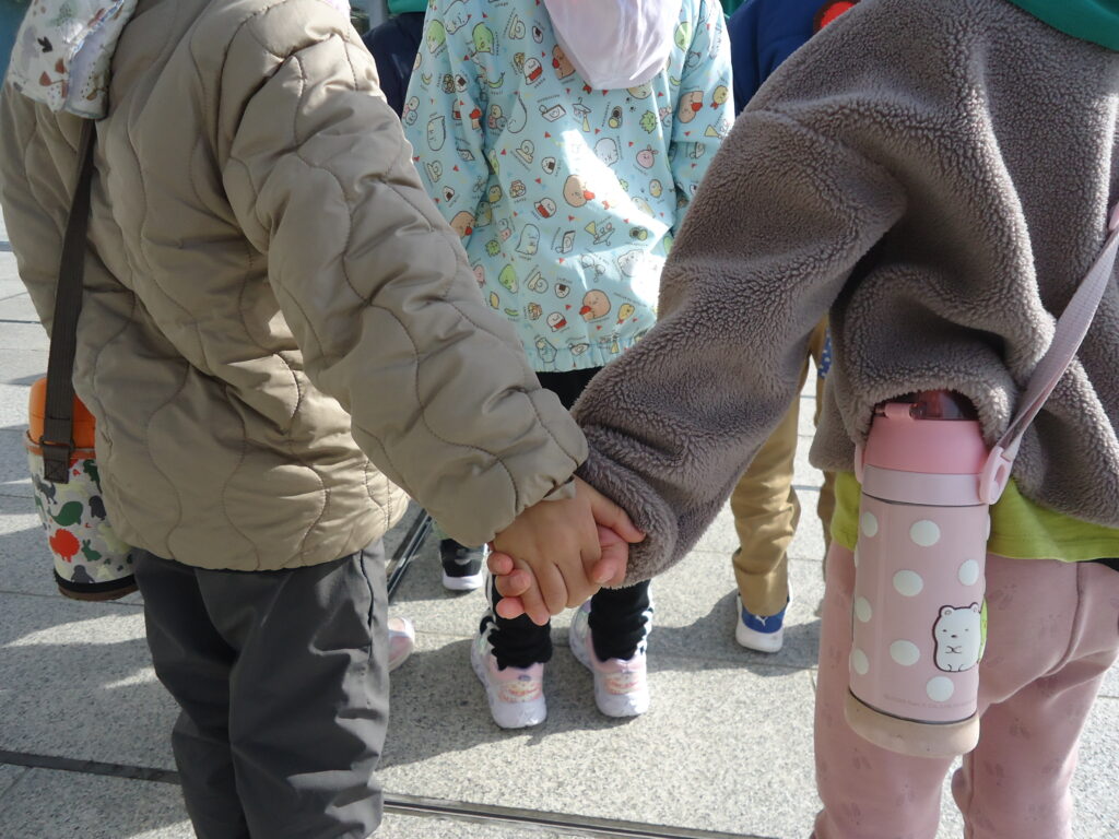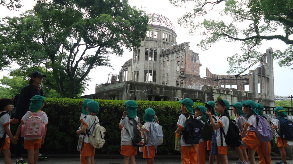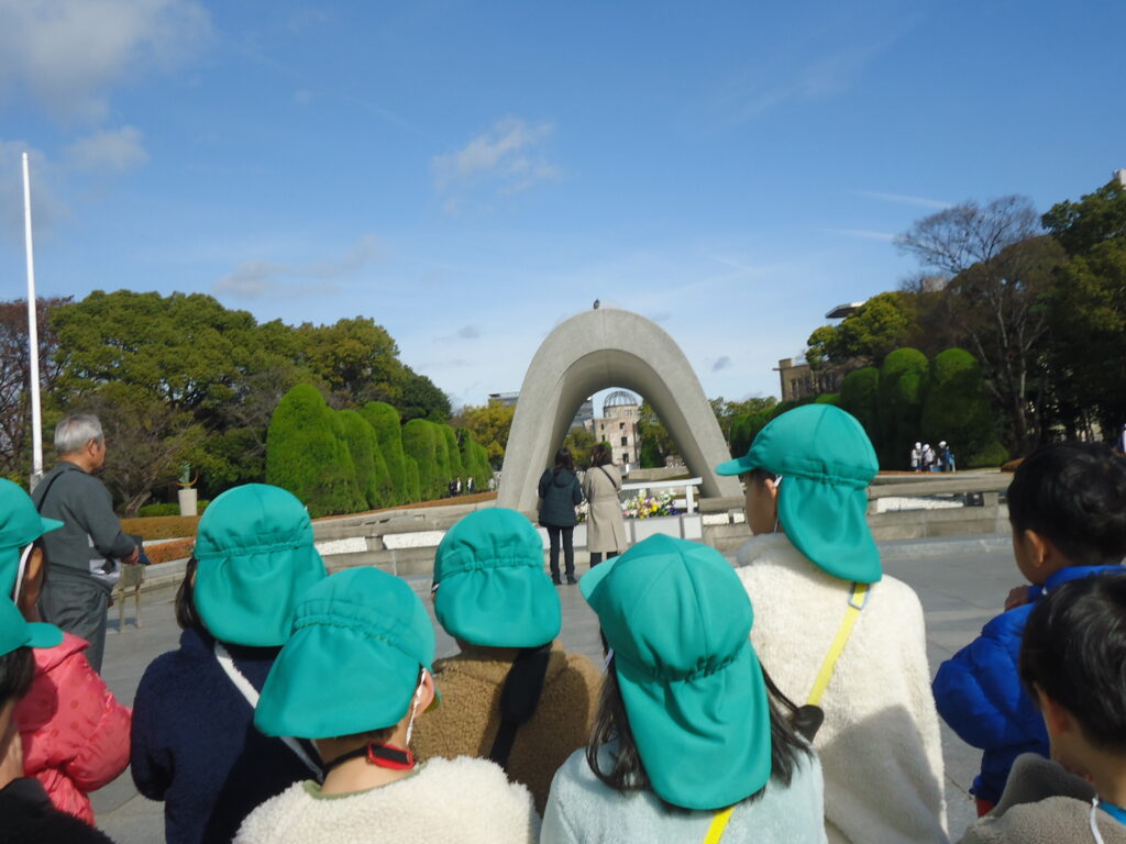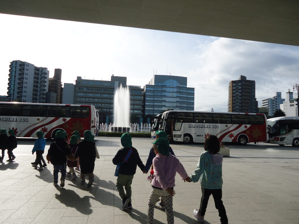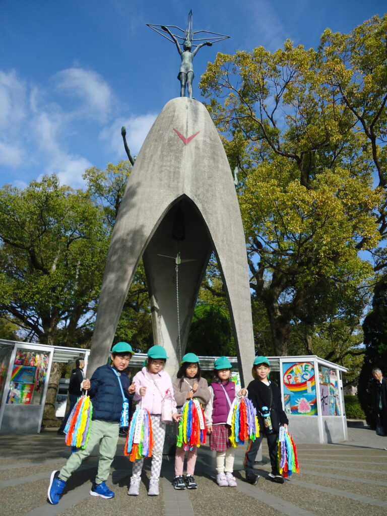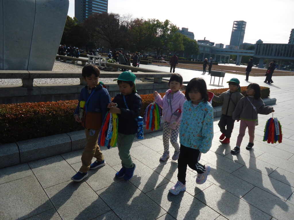 12月18日(月)に年長組さんで平和公園へ千羽鶴を届けにいきました。6月に行ったプラネタリウムの後訪れた平和公園で初めて目にした原爆ドーム。それから、原爆ドームって、平和公園って・・・・と平和について考えるようになりました。