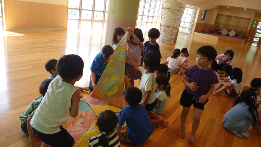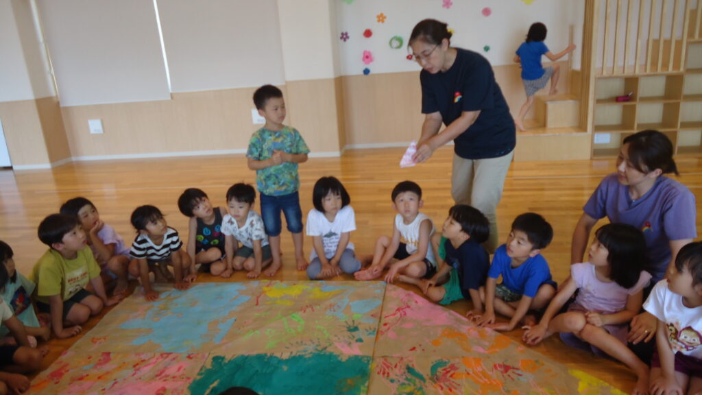 園に帰り、千羽鶴の話が沢山出てきました。子ども達の目に焼き付いていたんでしょうね。早速自分達でも折り鶴を折ろう!の輪が広がりました。そして、8月6日に向けてみんなで大きな紙を使い折り鶴を折ることに・・・・。