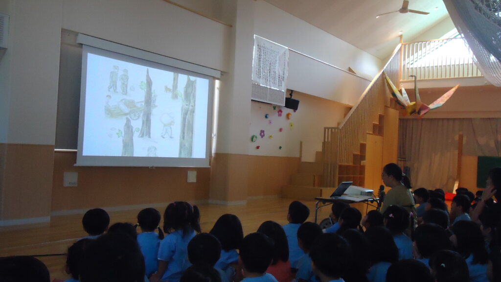 子ども達の背中を見ていると、今日色々感じた事、思った事を素直にしっかり受け止めているように見え、一回りも二回りも大きく感じました。平和って何だろう・・・・戦争はいけないことなんよね!を友だち同士でこれからも考えていけるように残りの園生活でも平和への取り組みを続けていきたいと思います。