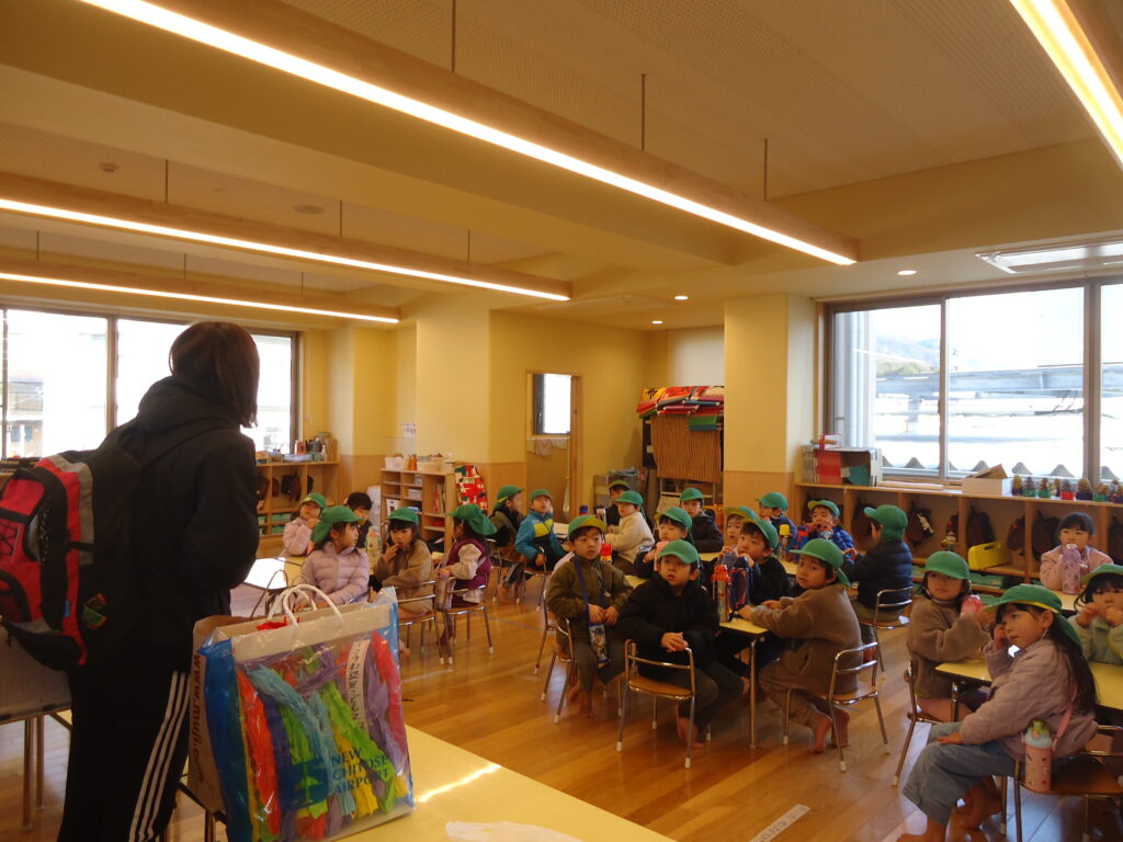 いよいよ千羽鶴を届けに行く日、朝から子ども達はこうわを代表して千羽鶴を届けに行くんだと真剣そのもの。