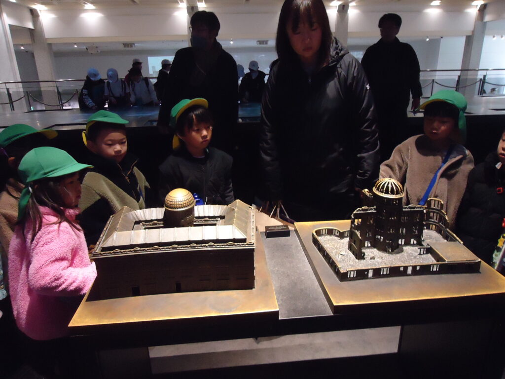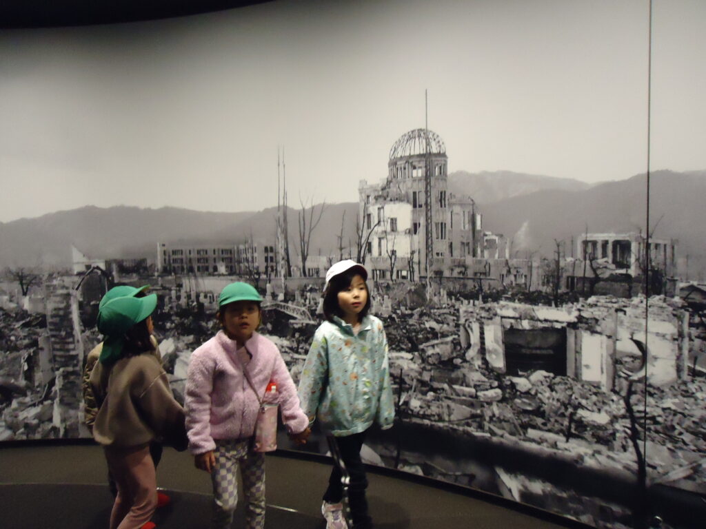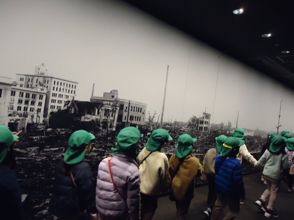 一瞬にしてガレキとなった広島の街を見た子ども達は「えっ!!」と言葉を失い、先生に「これさっきの街?」「原爆って本当の話なんだね」と信じられない思いで表情をこわばらせていました。