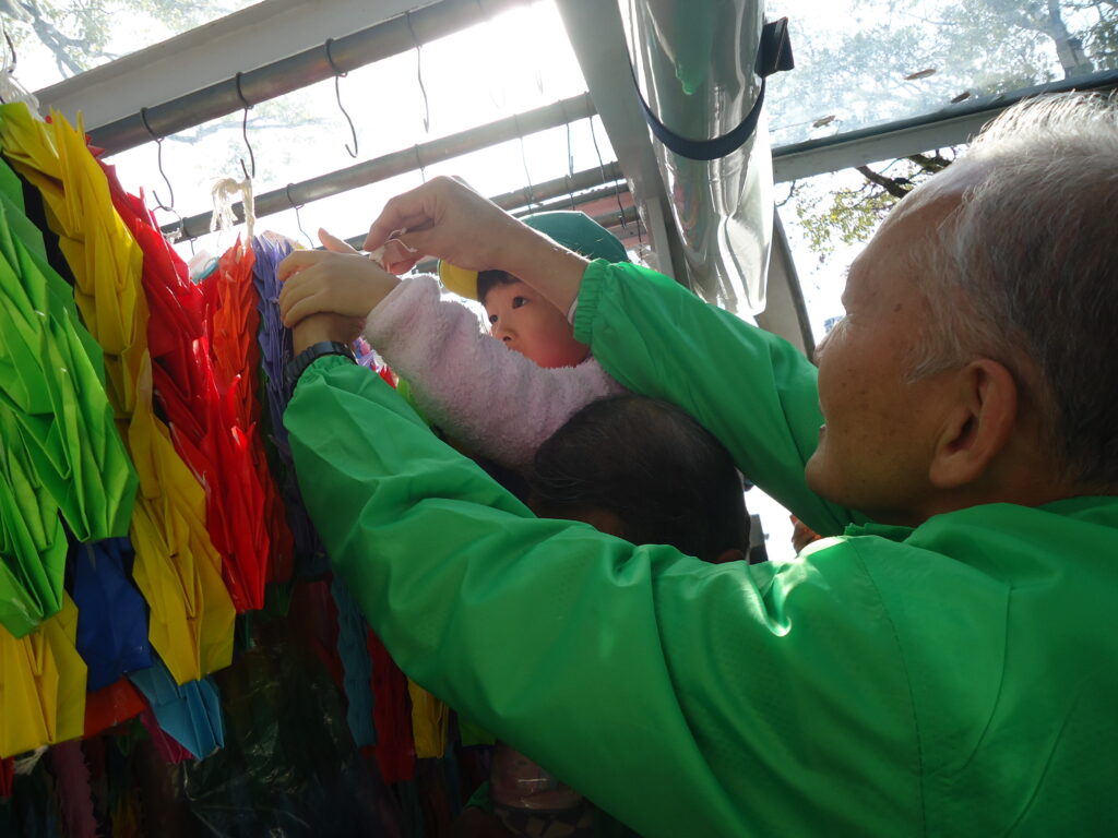 8月5日に行なわれた平和のつどいでは園長先生の朗読を聞きながら、「アオギリのねがい」を大きな折り鶴と共にみんなで見て、改めて戦争は怖いと実感。千羽鶴への思いは強くなり、園全体で千羽鶴に向けて、改めてスタート。9月の後半にはみんなから寄せられた折り鶴も含めて千羽に。(*^▽^*)その折り鶴はきい組さんが一羽ずつ糸を通し、千羽鶴が無事完成しました!!👏👏👏