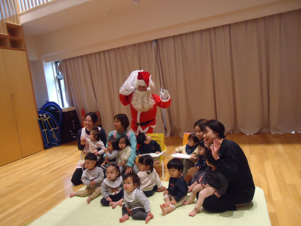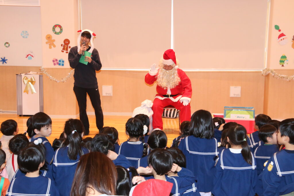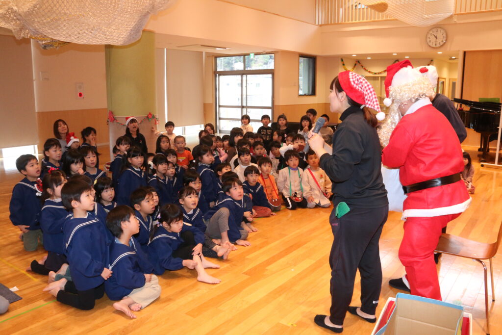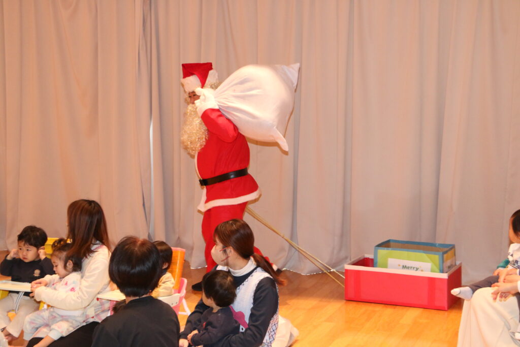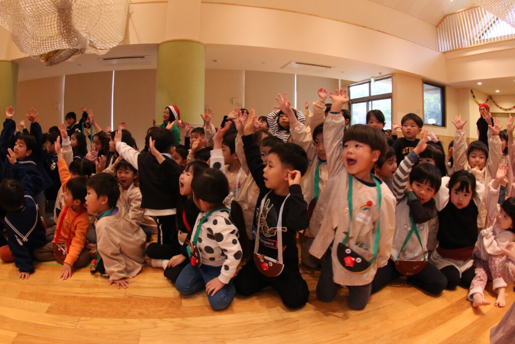 答えがわかると、一斉に元気よく手を挙げ、当てて当てての猛アピールの年中組さんや年少組さん(笑)クイズは大盛況でした。そして、クイズが終わりを告げると、どこからともなく鈴の音がリンリンリン♫・・・・・・。あっ!!サンタ🎅さんだ!!幼児組さんは大喜び!!