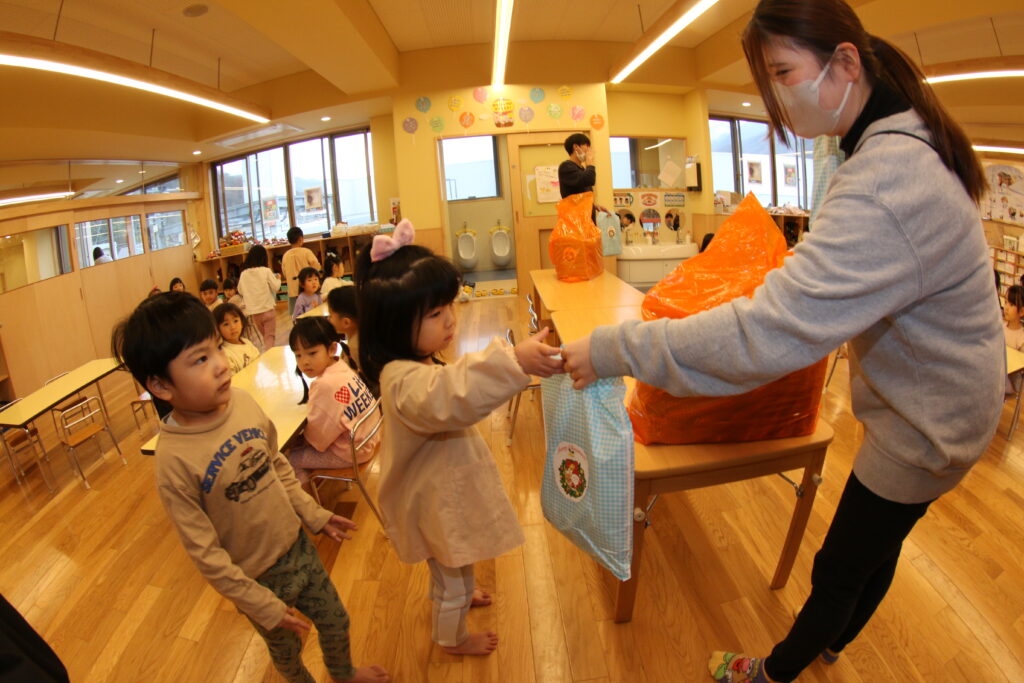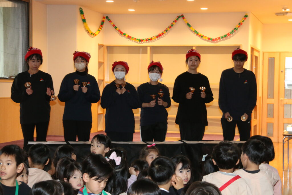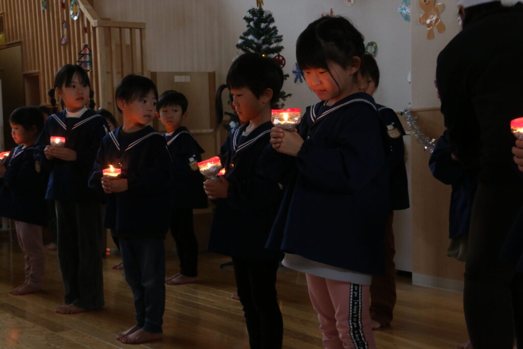 12月19日にクリスマス会が行われました。🎅さんからの手紙は来ていたものの、いったいいつ来るのか?ほんとにサンタさん来るのかなぁ・・・・と首を長くして待っていたので、クリスマス会の日はドキドキ・ワクワク、いつもより落ち着きがない様子の子どもたちも、年長組さんのキャンドルサービスとハンドベルの音で辺りの空気は一変し、クリスマスムードに🎄🕯