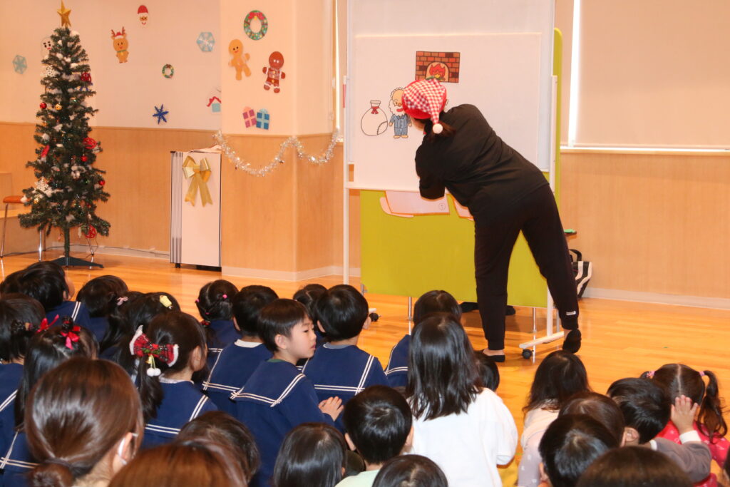 とっても素敵なキャンドルサービスでした。その後は、先生達からのプレゼントでサンタさんのペープサートやクリスマスにちなんだクイズがありました。