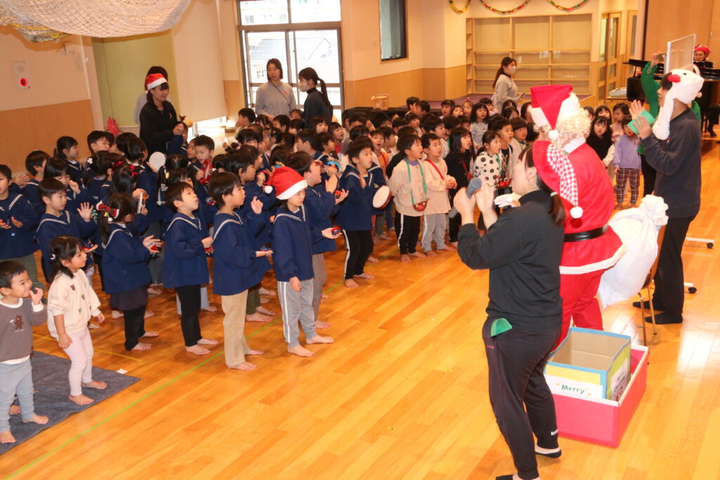 プレゼントをくれるサンタさんには、みんなから「あわてんぼうのサンタクロース」の歌のプレゼントを♬(^^♪♬ 年長組さんは、好きな打楽器を持ちリズムを取りながら歌うなど、楽しくみんなが盛り上がりました。(*^▽^*)サンタさん、また、来年も来てね👋と写真を一緒に撮ってお別れしました。
