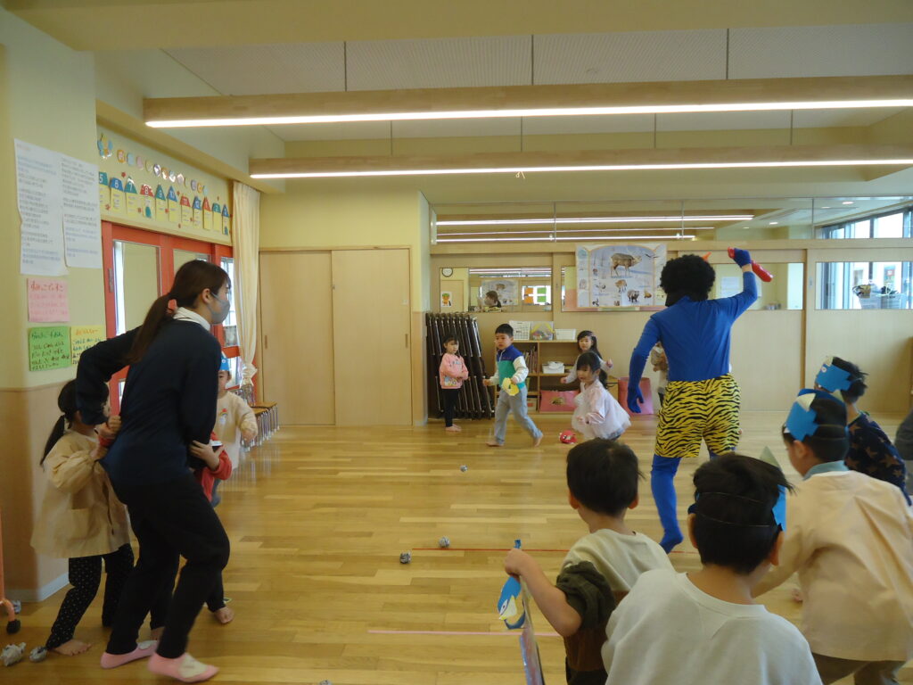そしていよいよ、年長組さん・・・・怖いけど、鬼めがけてコントロールよく豆を投げたり、鬼の動きを見て逃げ回る所は、さすが年長組さんです🤗