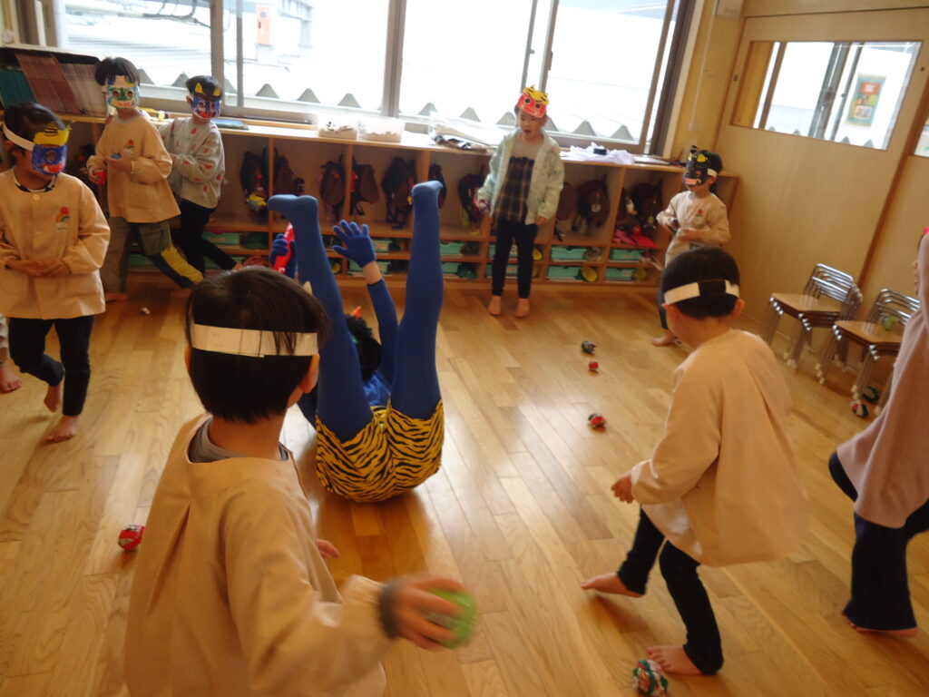 年中組さんは・・・・・怖いけど、逃げる逃げる・・さすがですね(笑)鬼に捕まらないように上手に逃げながらも、鬼は~外!と泣きながら豆を投げ、