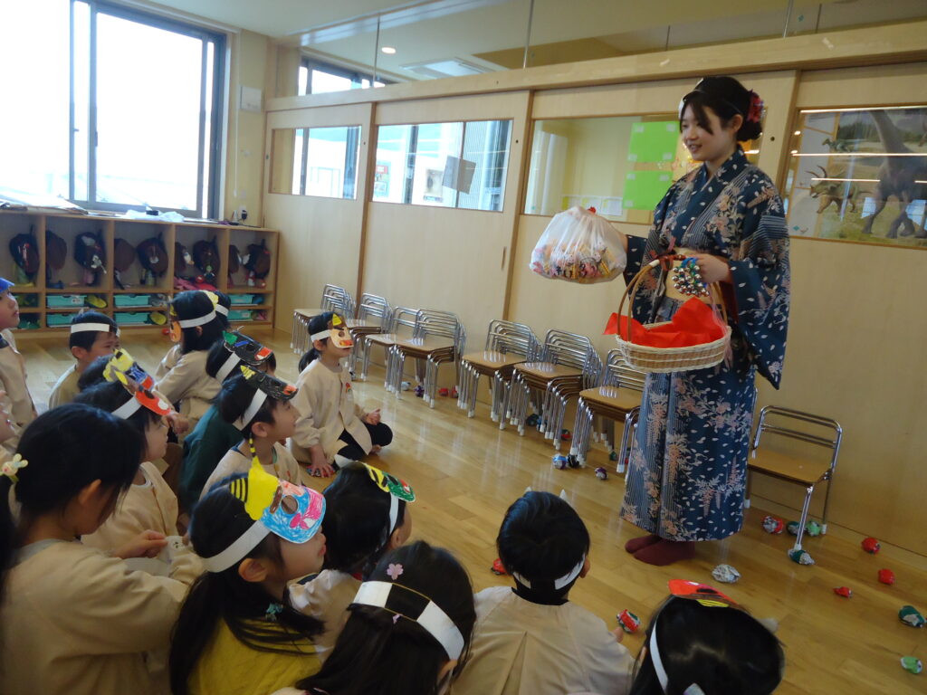 「みなさんにとって、幸せな1年が来ますように・・・」「この豆を食べてくださいね💓」と福の神がみんなに豆をくれました。