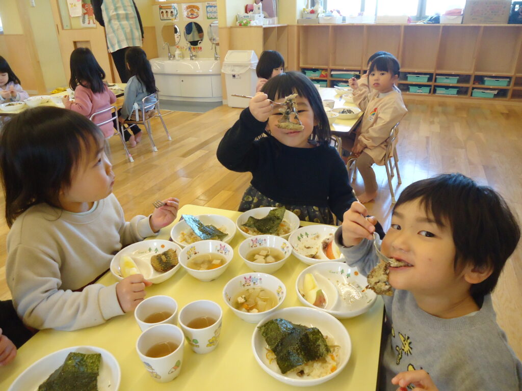 そして、おまちかねの給食は・・・・自分で巻く恵方巻といわしの香草焼きとけんちん汁!!