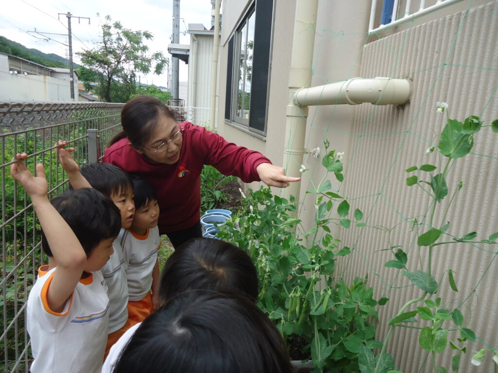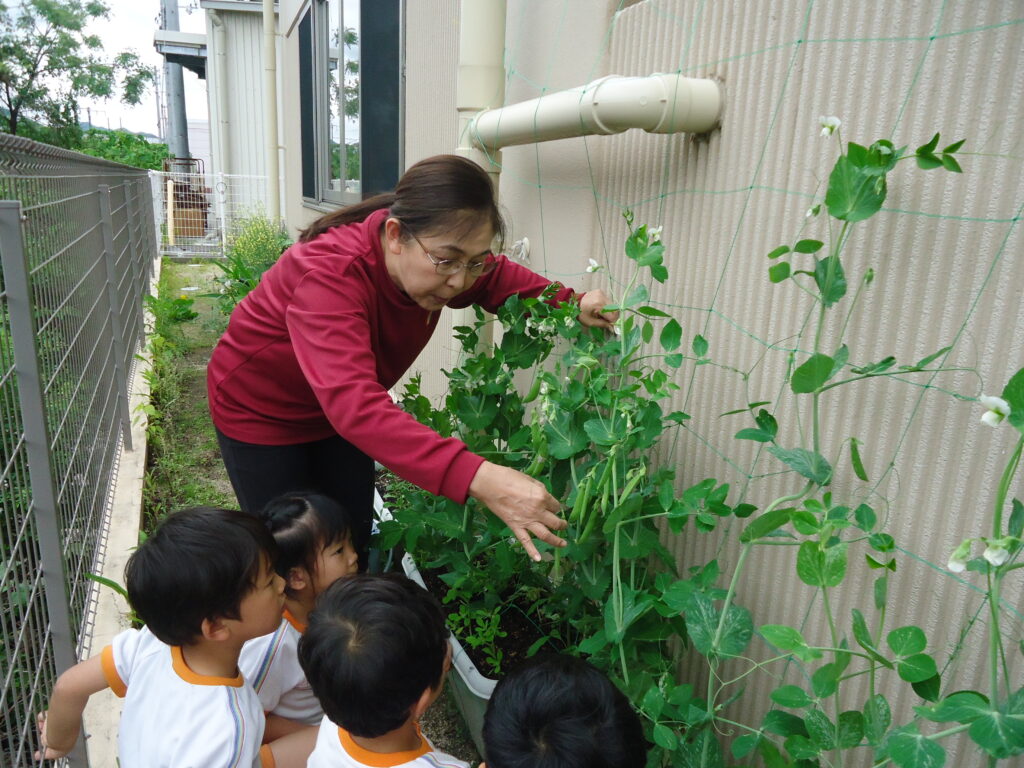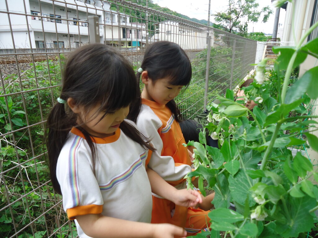3月に植えたスナップエンドウの苗がぐんぐん大きくなったので、年長組さんと収穫することになりました。