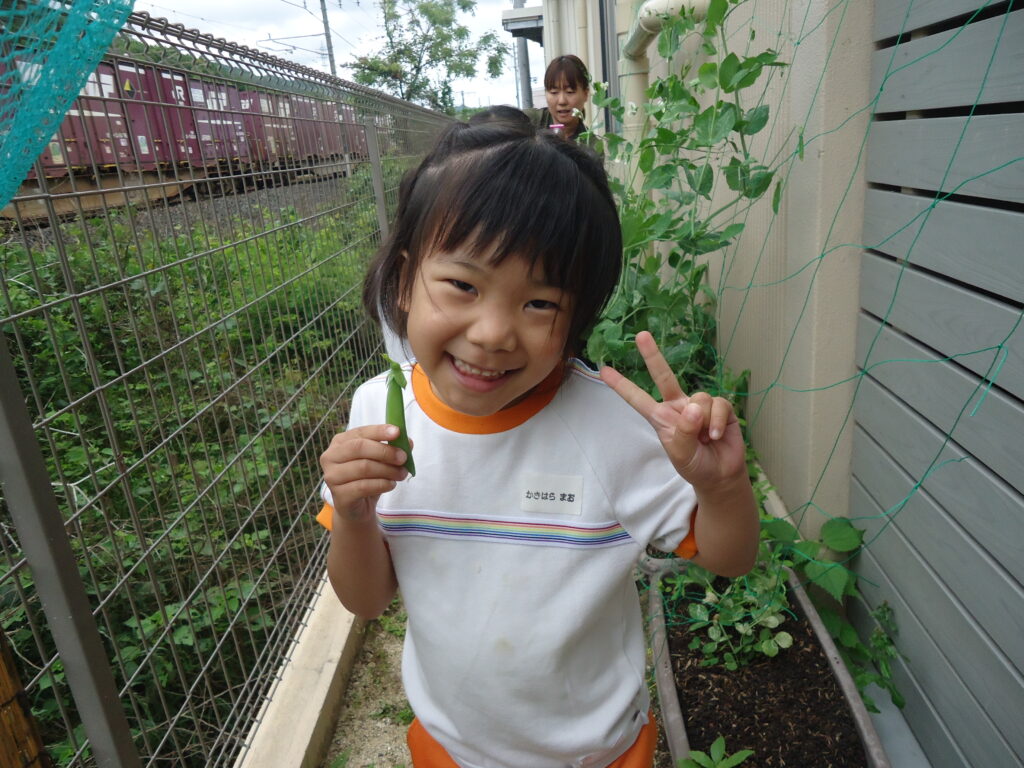 園長先生に教えてもらったように上手にスナップエンドウを摘む事が出来てハイポーズ!!(^▽^)/