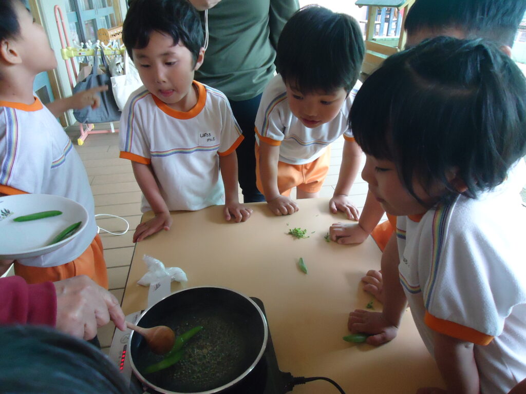 みんなで摘んだスナップエンドウを今度は煮立ったお湯にお塩をパラパラ…。「1.2.3.4.…」とみんなで20数えていくうちに綺麗な緑色に変身!!茹でたスナップエンドウ出してもらい、いよいよ試食👦👧