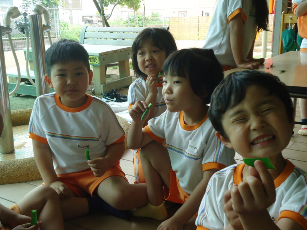 まず初めに園長先生が「このお豆は何ていう名前でしょう!」と質問しましたが中々豆の名前が出てきませんでしたが・・・・・(^^;)答えは「スナップエンドウだよ」と教えてもらうと、「聞いた事ある~!」というお友だちも。(*^-^*)普段お家の人とお買い物に行くスーパーで見かけた事を思い出したようです。(笑)大きく育った豆の上のつるにはスナップエンドウの花も。そのお花が白くて可愛い💕のでみんなで観察👀