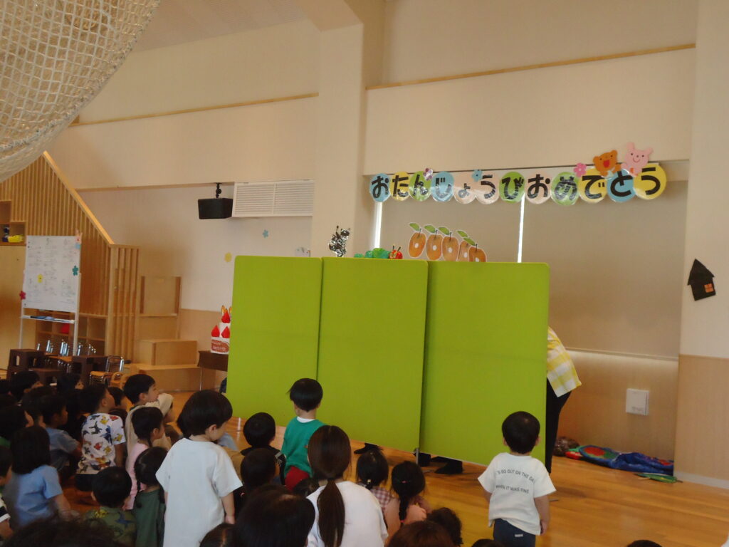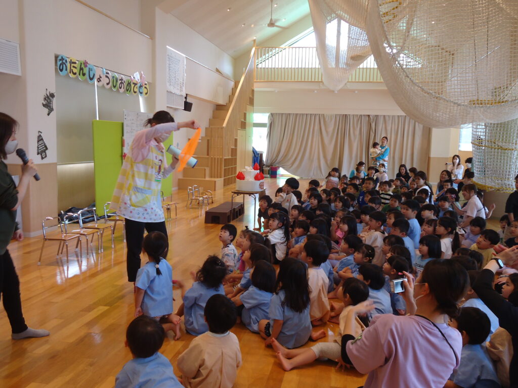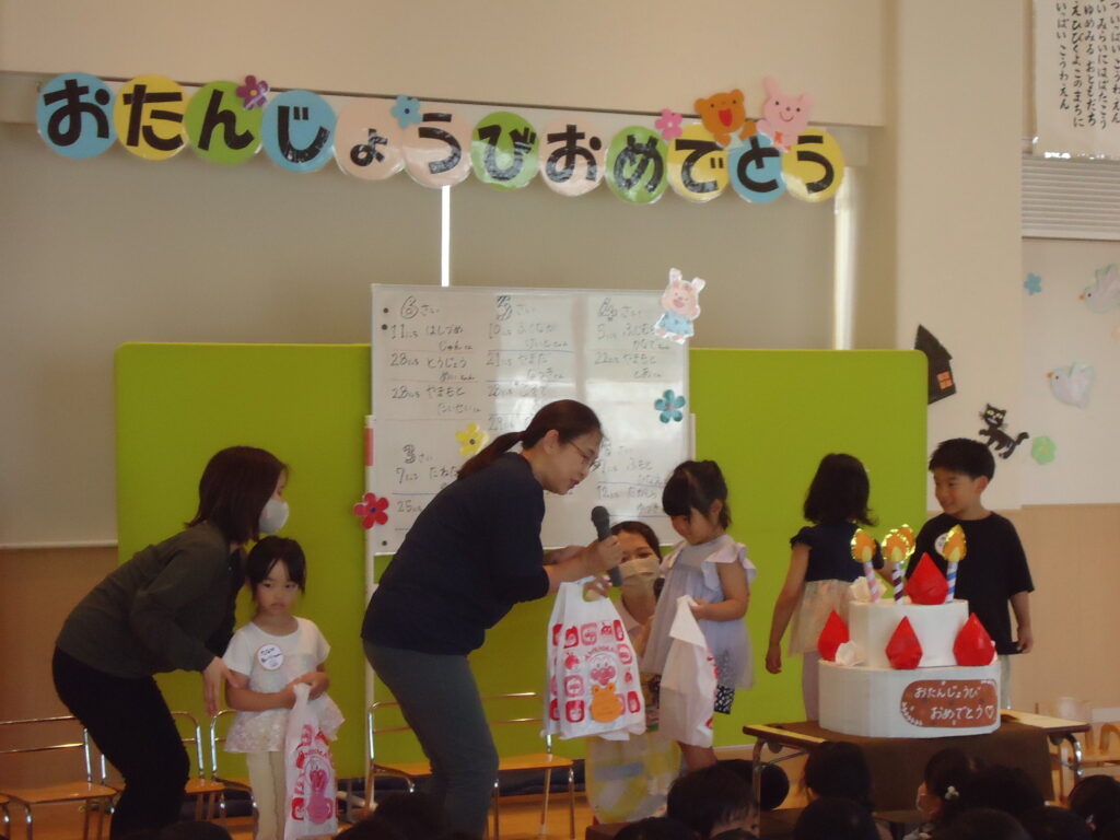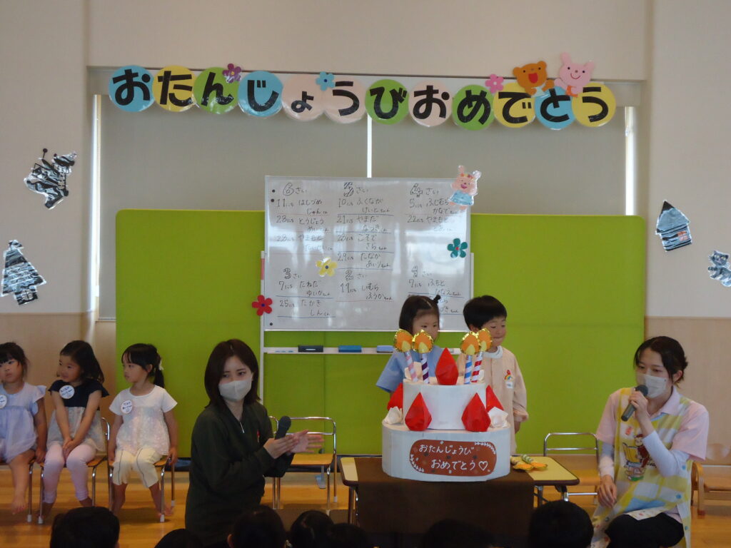 5月21日(火)にホールで5月生まれのお誕生日会が行われました。今月のお誕生日のお友だちは14名。