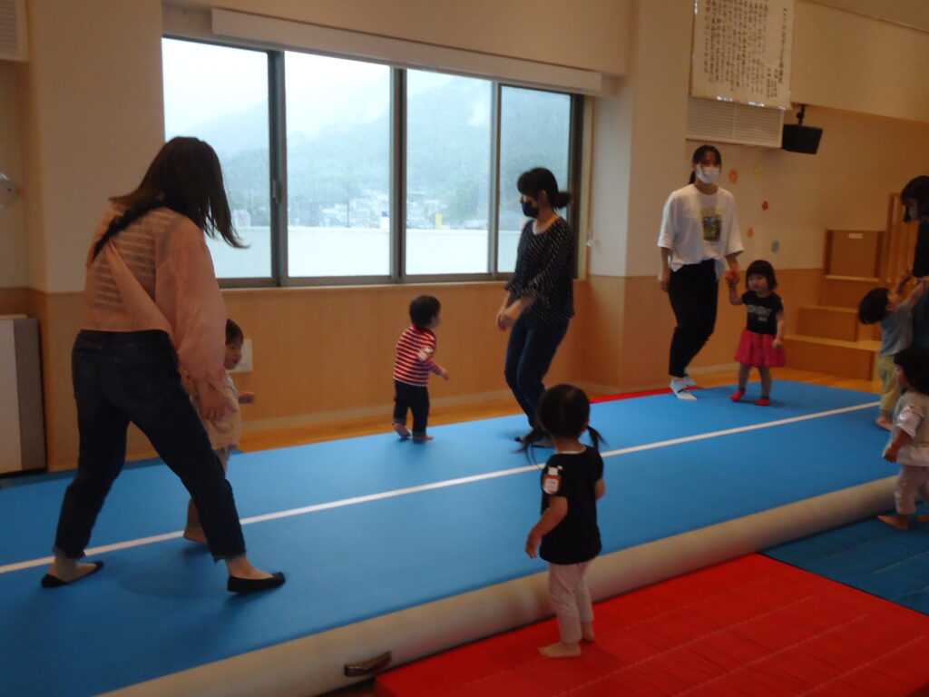 今月は「運動遊びを楽しもう!」。園でいつも遊んでいるエアートラックマットやフープ、跳び箱など色々用意すると、初めてみるエアートラックマットに早速お家の方と挑戦!!(*^-^*)広いマットにコロコロ転がったり。、ピョンピョン跳ねたり、とっても楽しそうでした🎵