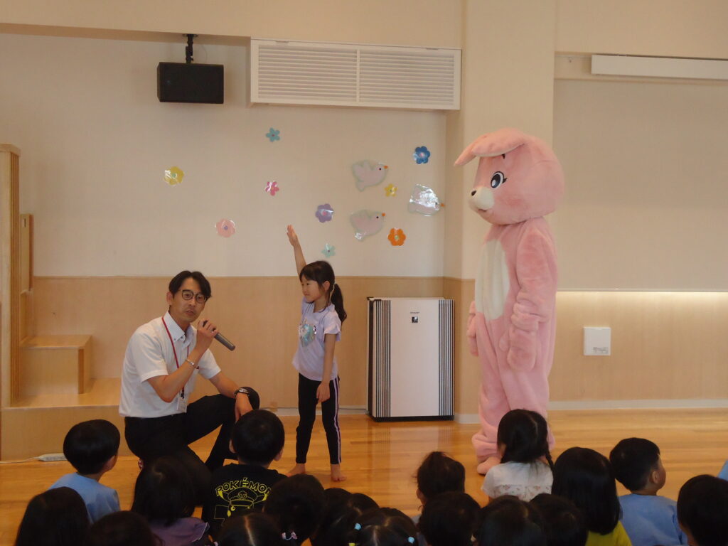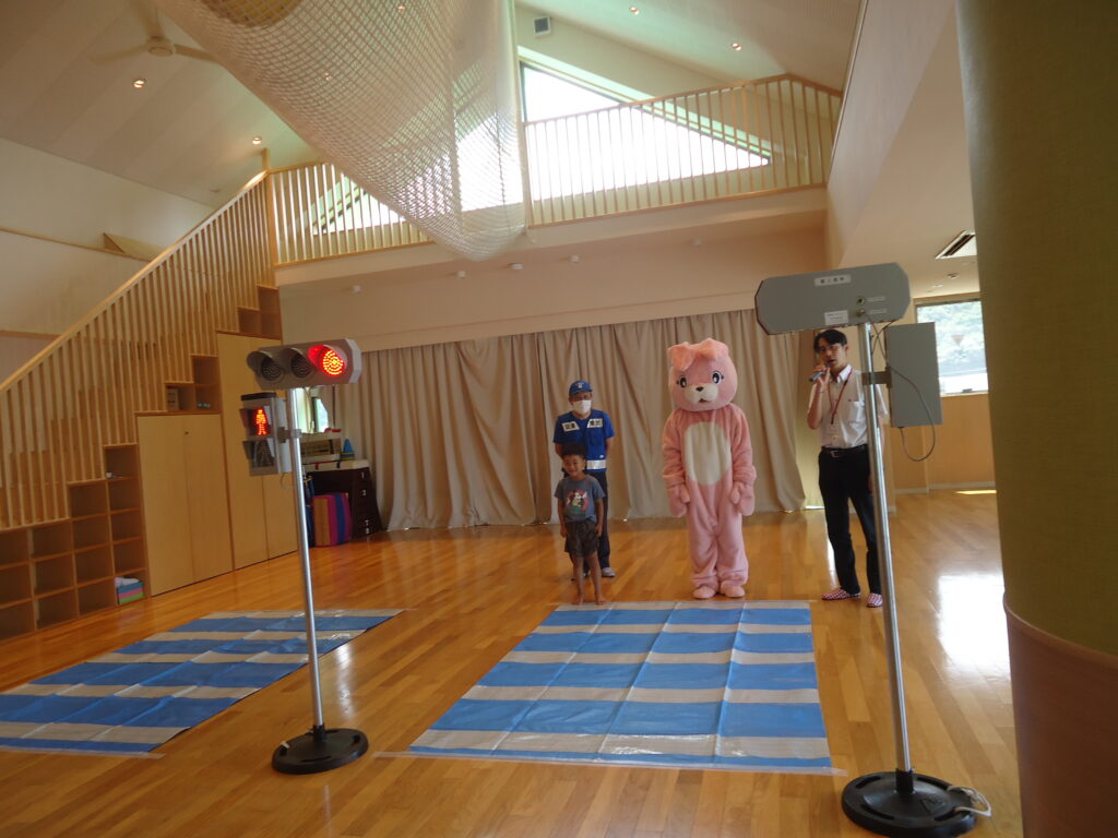 年長組のお友だちはぴょんたくんに習って横断歩道を渡る時の大事なお約束を聞かれると・・・・。手をしっかり上げて車が来ないか確かめて渡る事を答えてくれました。